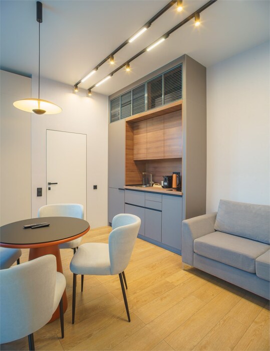 Оснащение виллы: кофейно-чайная станция, оборудованная кухня с обеденной зоной: чайник, капсульная кофемашина, холодильник, плита, посудомоечная машина, микроволновая печь, полный набор посуды для готовки и сервировки, халаты, тапочки, полотенца, фен, набор гигиенических и туалетных принадлежностей (зубной набор, гель для душа, шампунь, шапочка для душа, гигиенический набор).