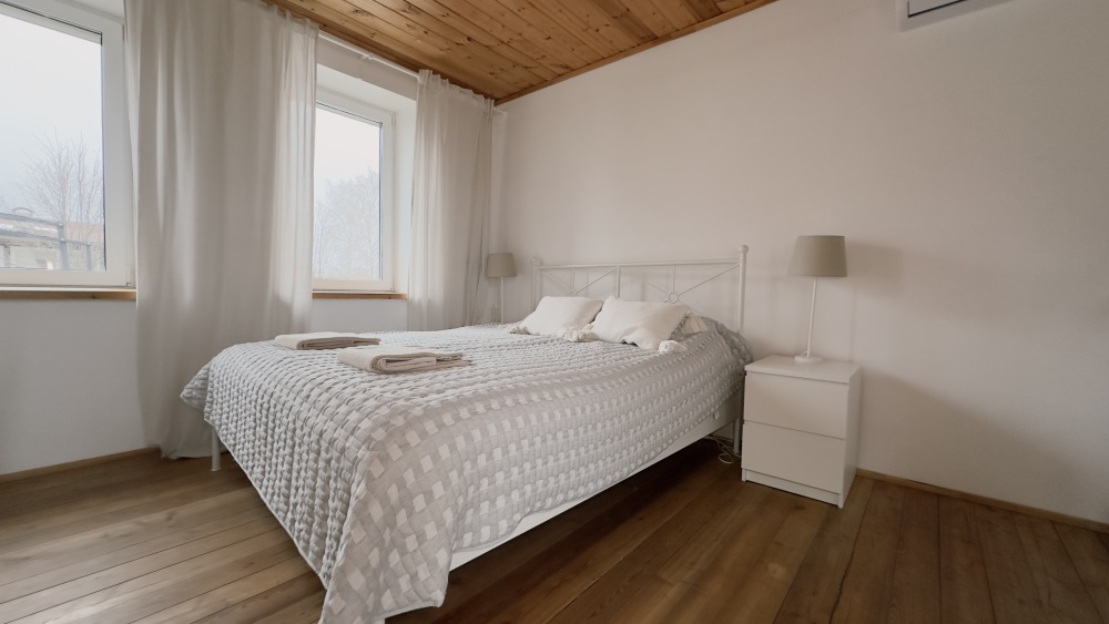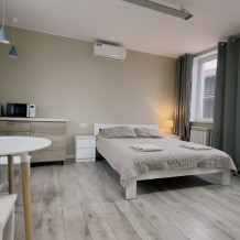 Уютные светлые апартаменты 30 м² с отдельным входом на втором этаже — отличный вариант для двух гостей. Комната с двумя полуторными кроватями, TV и кондиционером. Кухонный уголок с техникой и посудой, санузел с душем и стиральной машиной. Включены Wi-Fi, постельное бельё и полотенца. Парковка рядом с домом.