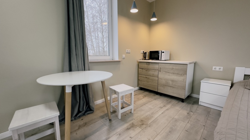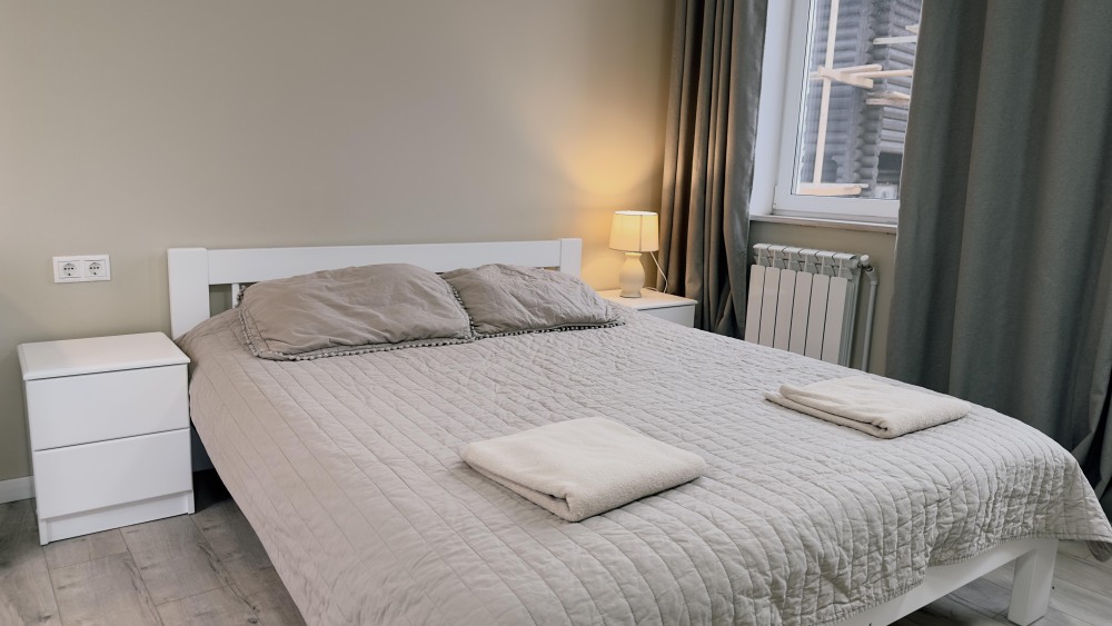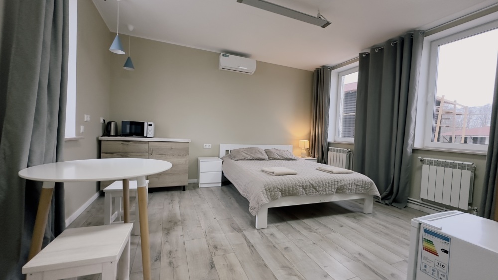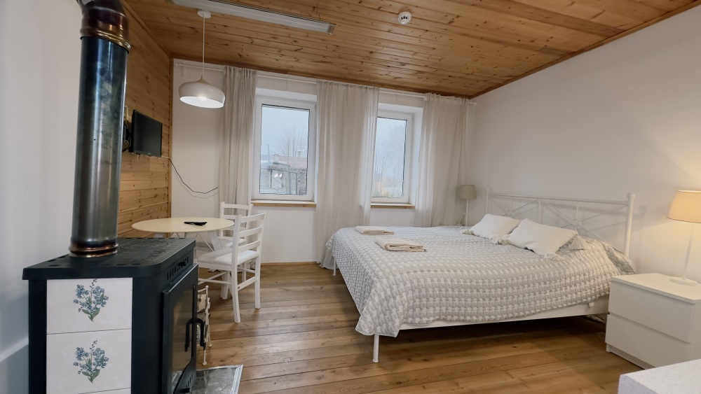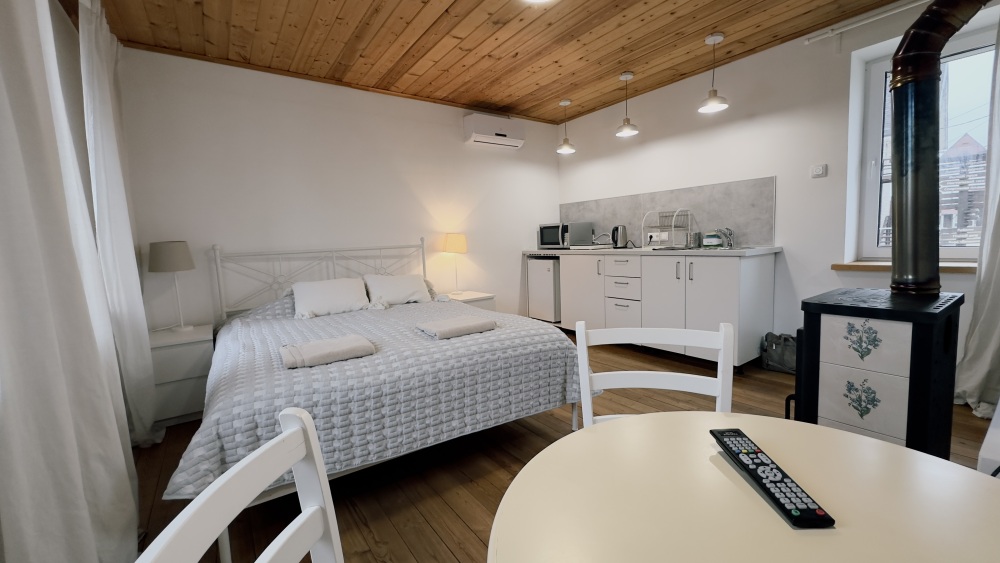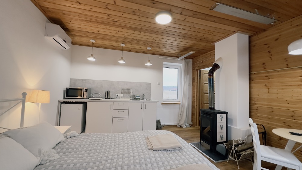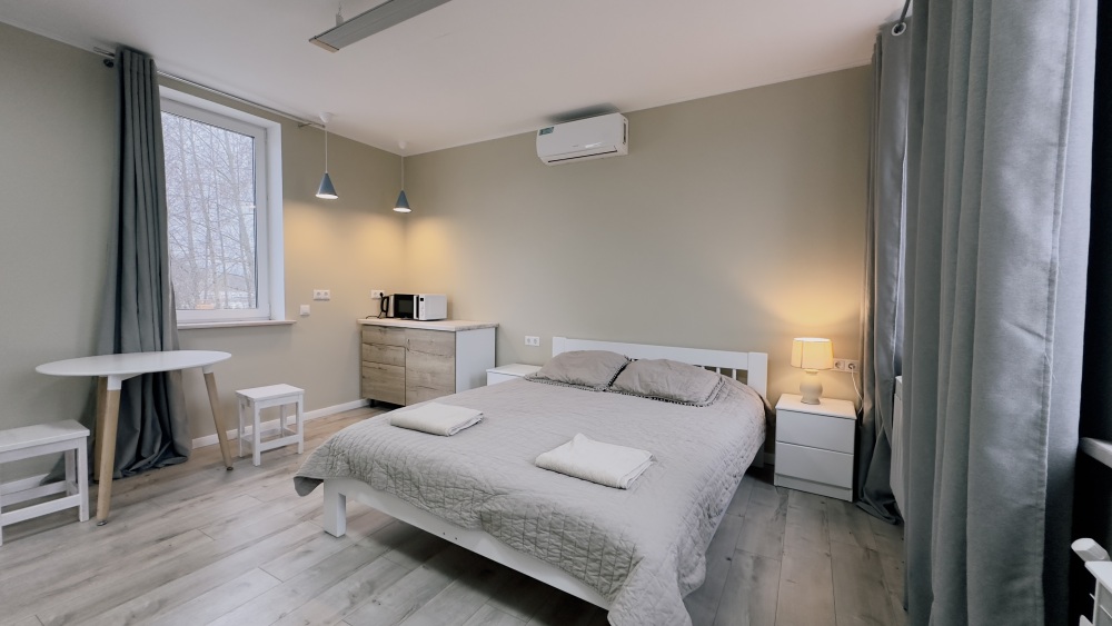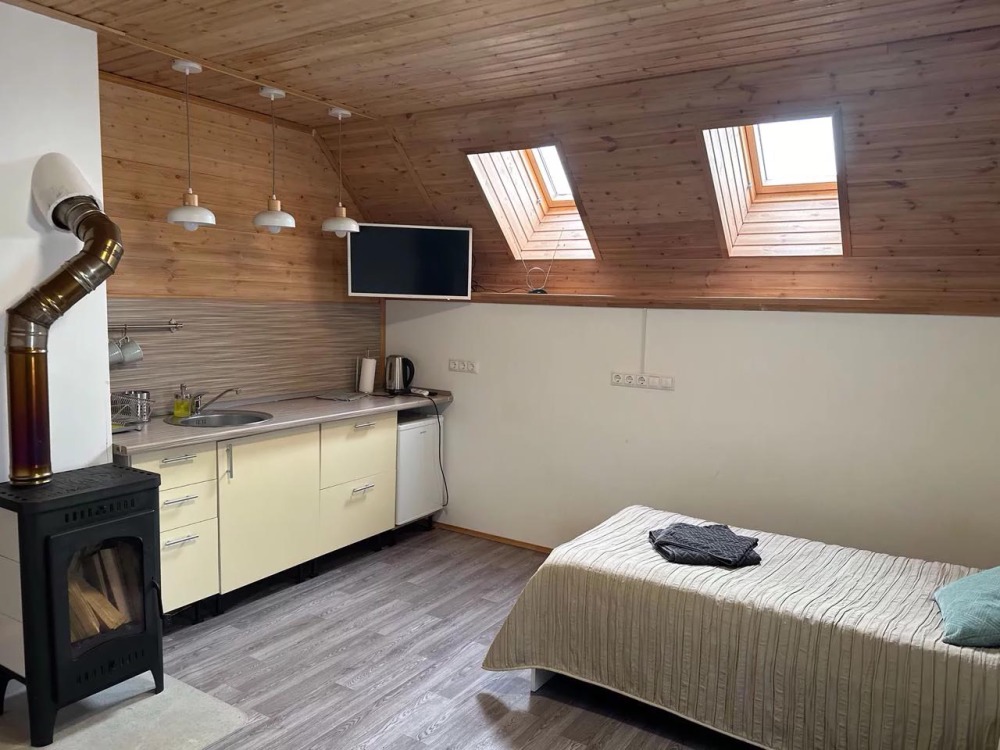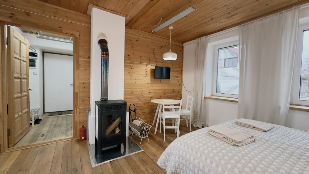 Уютные апартаменты 30 м² с отдельным входом — отличный вариант для романтического отдыха или спокойного уикенда. Светлая комната с двуспальной кроватью, кухня с техникой, санузел с душем и биде. Печь-камин создаёт особый уют. В наличии TV, Wi-Fi, стиральная машина, посуда, постельное бельё. Парковка рядом. Подходят для 2 гостей.