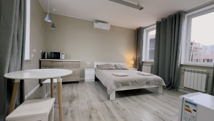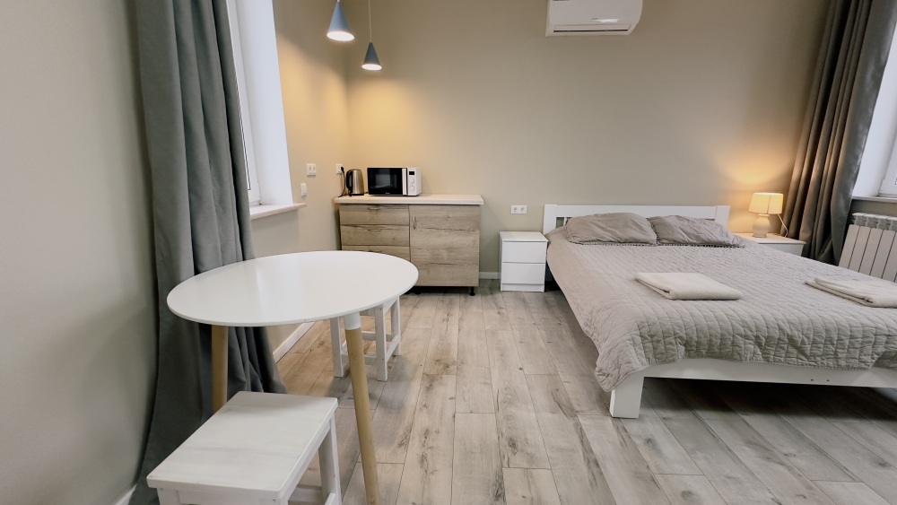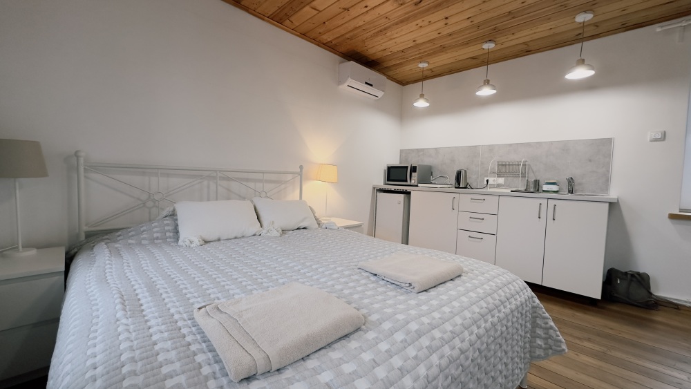 Уютные апартаменты 30 м² с отдельным входом — отличный вариант для романтического или семейного отдыха. Светлая комната с двуспальной кроватью, TV и кондиционером, полностью оборудованная кухня, санузел с душевой кабиной и стиральной машиной. Есть Wi-Fi, постельное бельё и полотенца. Парковка рядом. Подходят для 2 гостей.