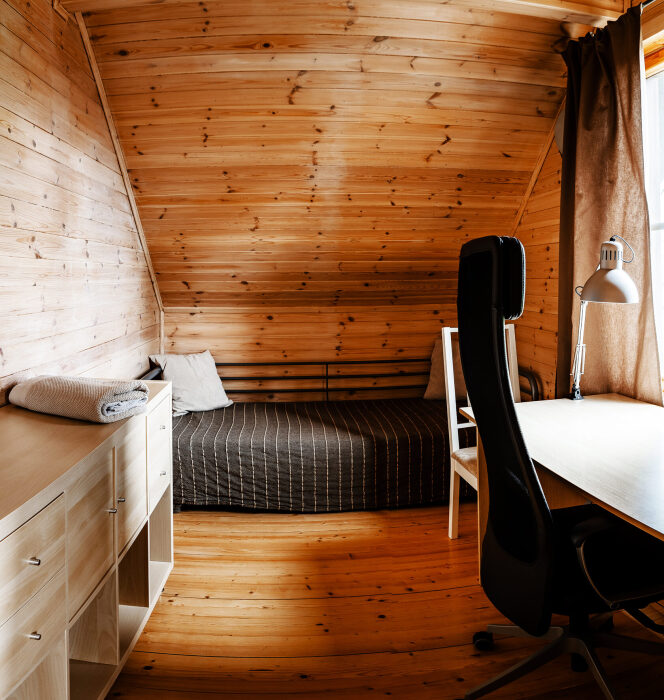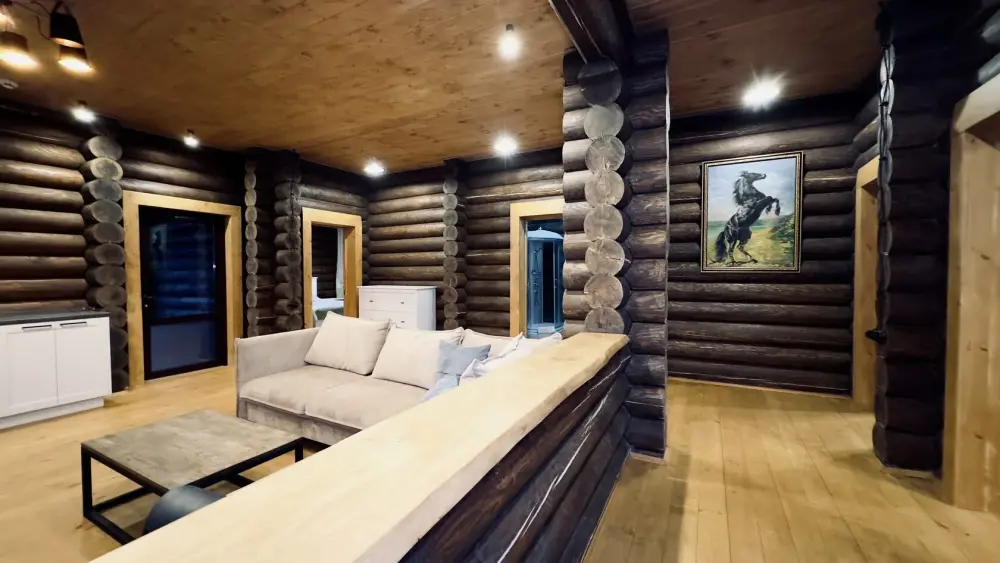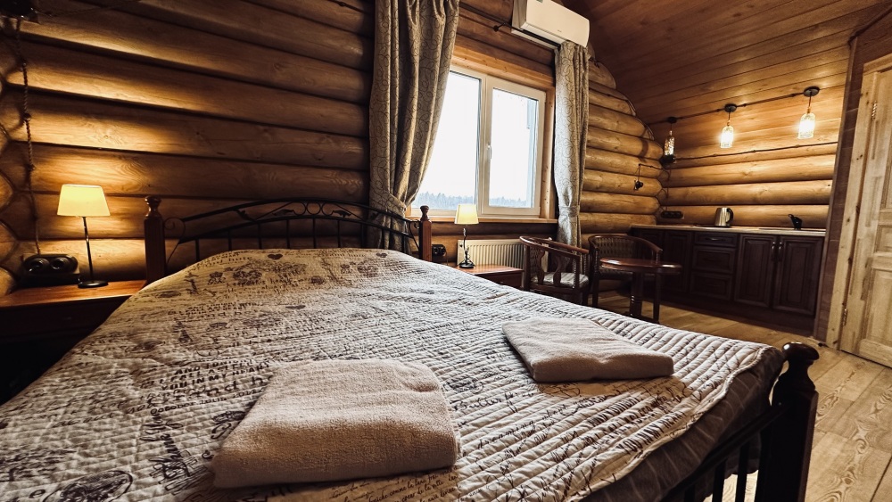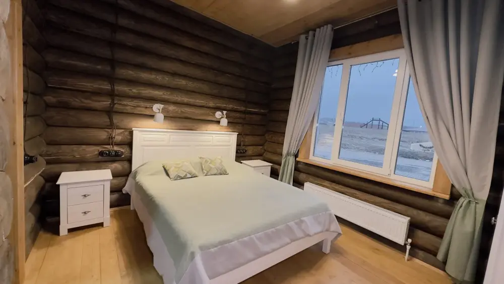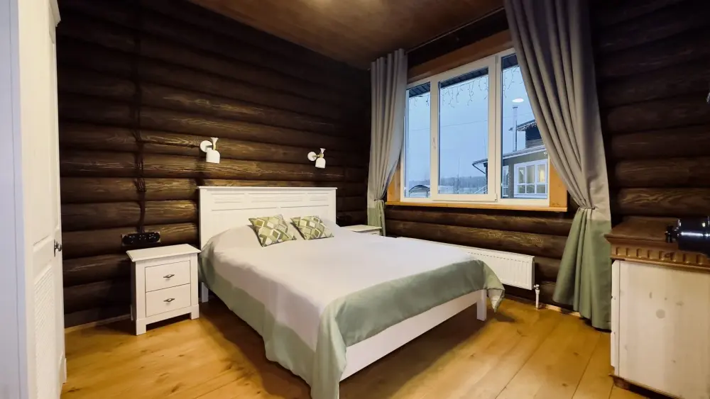 Уютный дом из сруба площадью 105 м² идеально подойдёт для отдыха двумя семьями или небольшой компанией. Натуральное дерево наполняет дом особым теплом, а продуманная планировка делает пребывание максимально комфортным. В доме две изолированные спальни с двуспальными кроватями, каждая со своим отдельным санузлом и душевой кабиной, что особенно удобно для гостей. В просторной гостиной расположен раскладной двуспальный диван, позволяющий разместить до 6 человек.