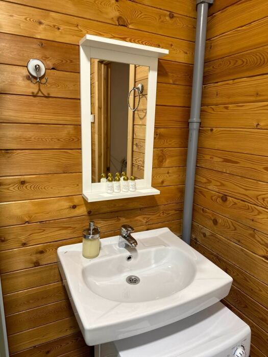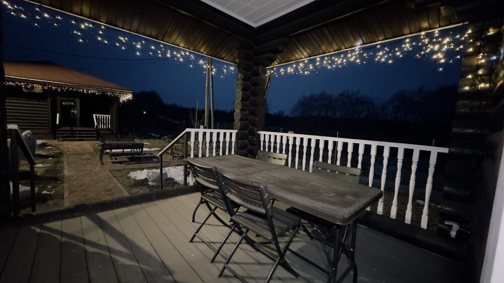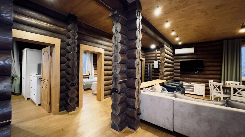 Уютный дом из сруба площадью 105 м² с отдельной террасой идеально подойдёт для небольшой семьи или компании друзей. Натуральное дерево создаёт атмосферу тепла и спокойствия, а продуманная планировка обеспечивает комфорт каждому гостю. В доме две изолированные спальни с двуспальными кроватями — каждая оборудована кондиционером и собственным санузлом с душевой кабиной. В гостиной расположен раскладной двуспальный диван, что делает размещение ещё более удобным.