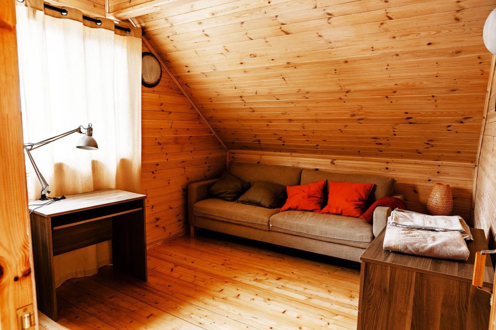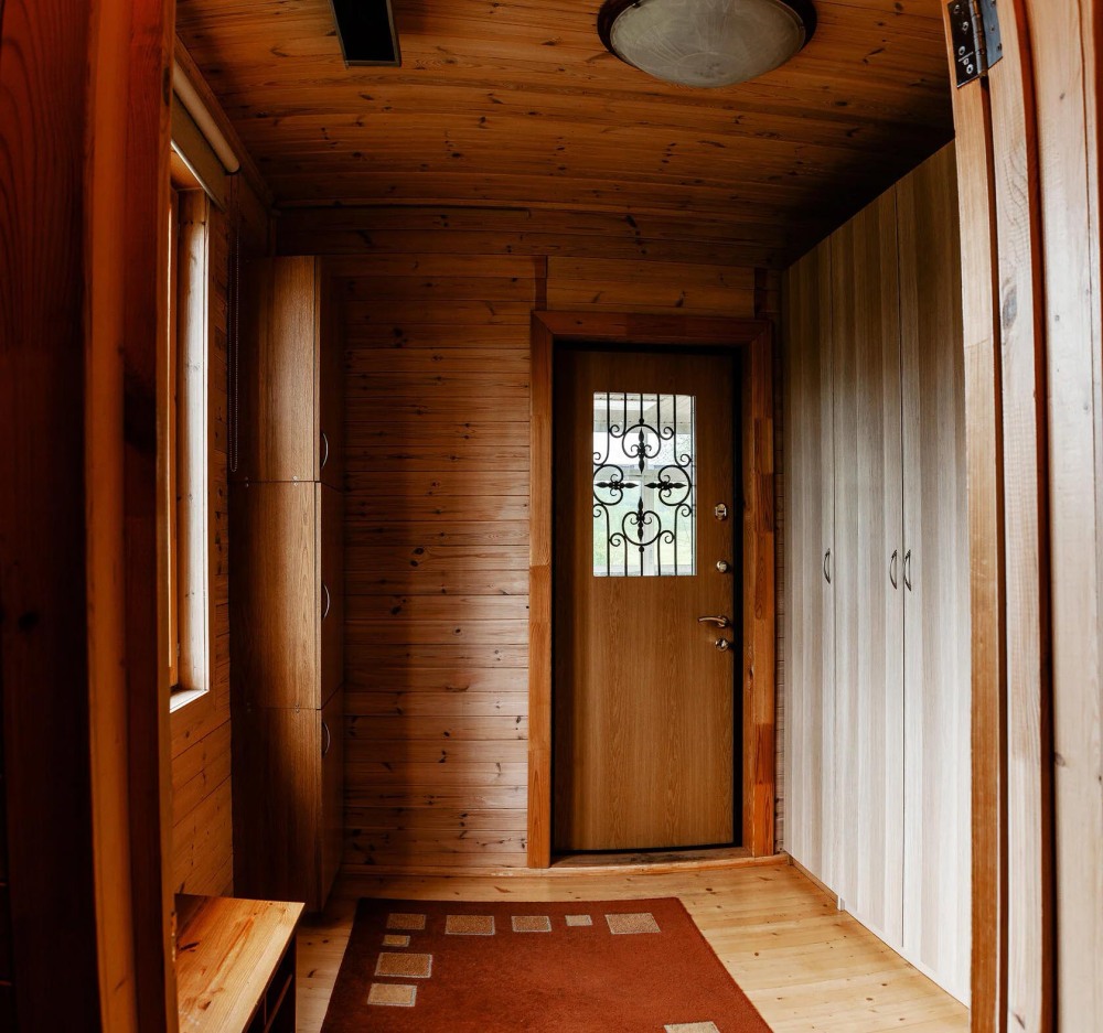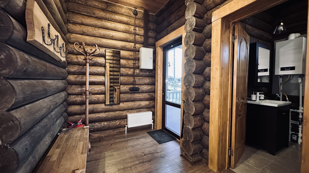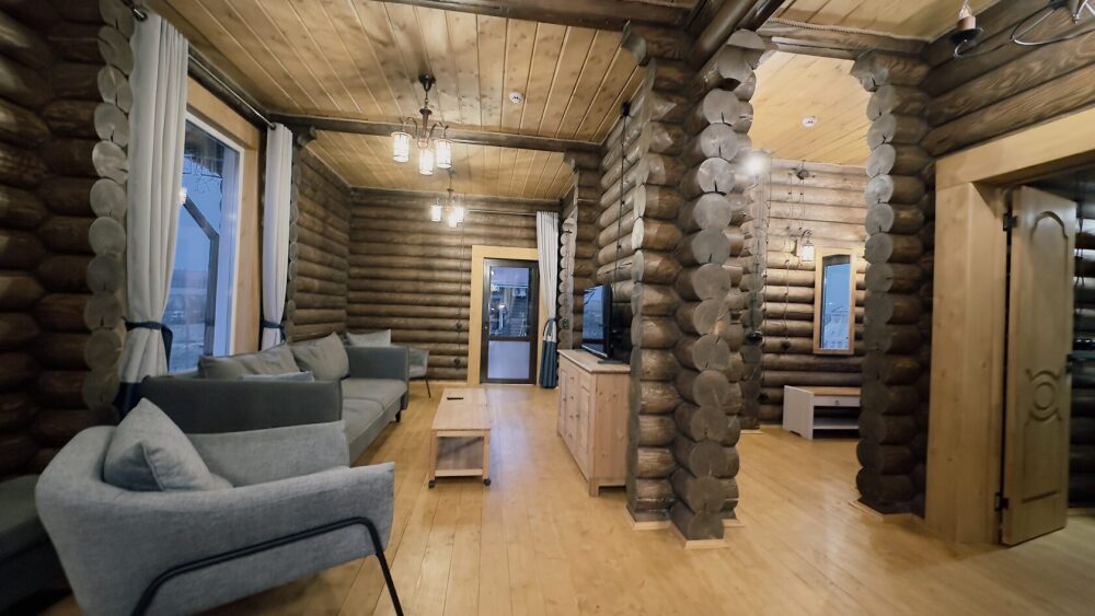 Просторный дом из сруба площадью 120 м² идеально подойдёт для большой семьи или компании друзей. Натуральное дерево и тёплый интерьер создают атмосферу загородного уюта, а продуманная планировка обеспечивает комфортное проживание для всех гостей. В доме 3 изолированные спальни: две с двуспальными кроватями и одна с двумя односпальными (вместимость 6 человек). В просторной гостиной расположена мягкая мебель и раскладной двуспальный диван, который при необходимости позволит разместить ещё 2 гостей.
