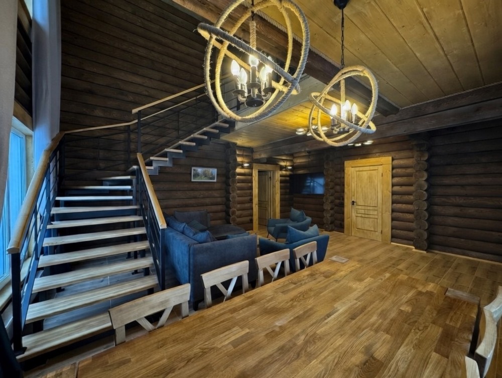 Просторный двухэтажный дом из сруба площадью 183 м² — отличный выбор для отдыха большой семьи или дружной компании. Натуральное дерево и тёплый интерьер создают атмосферу загородного уюта, а продуманная планировка обеспечивает комфортное проживание для всех гостей. В доме 4 изолированные спальни с удобными двуспальными и односпальными кроватями, а 3 санузла с душевыми кабинами особенно удобны при размещении нескольких семей.