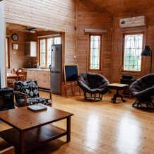 Просторный дом из сруба площадью 132 м² идеально подойдёт для семьи или компании друзей. Натуральное дерево и тёплая атмосфера загородного дома делают отдых особенно комфортным и душевным. В доме две изолированные спальни с двуспальными кроватями (вместимость 4 человека), а в гостиной на раскладном диване смогут удобно разместиться ещё 2 гостя.