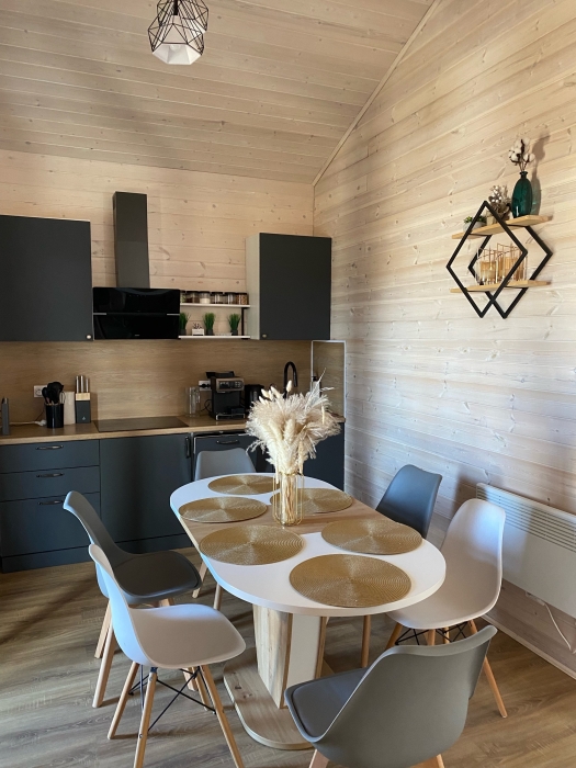 В кухне-гостиной установлены панорамные окна с видом на озеро.