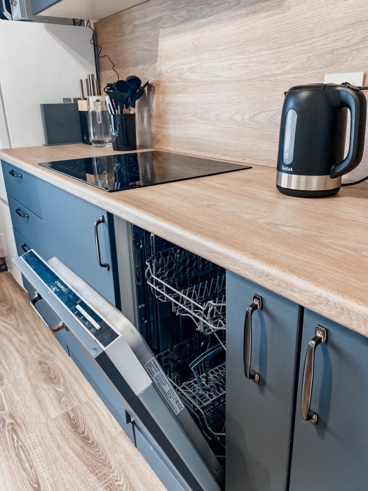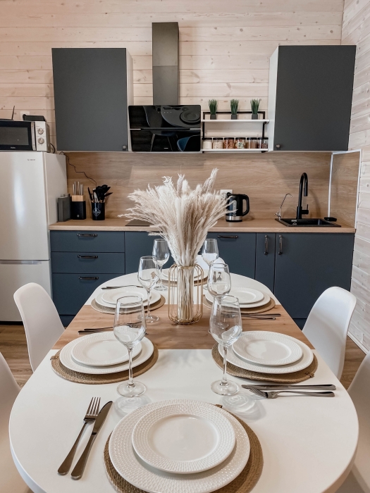 - посудомоечная машина, чайник, микроволновка, холодильник, варочная панель + вся необходимая посуда на 8 человек;