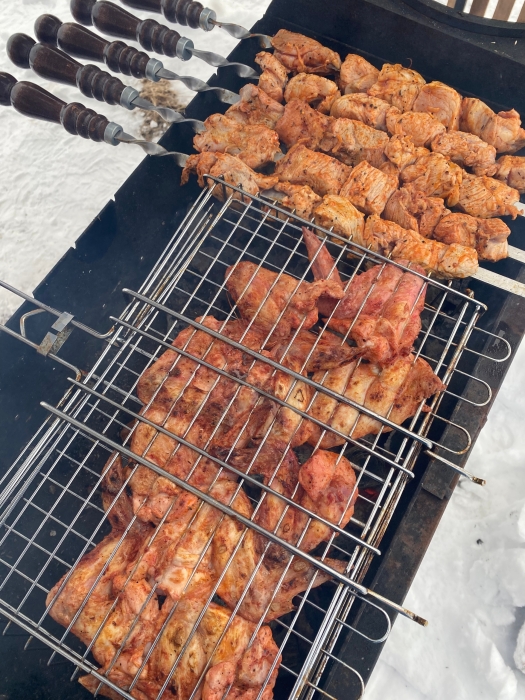 - мангал, решетка, шампура, казан, коптильня горячего копчения (с собой остаётся взять только дрова или угли).