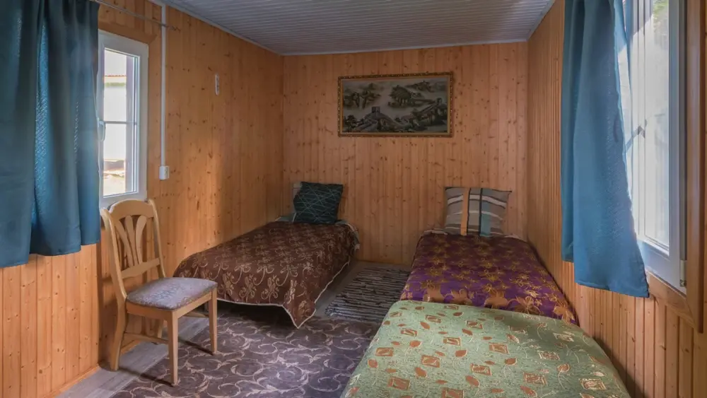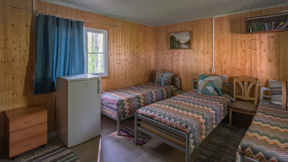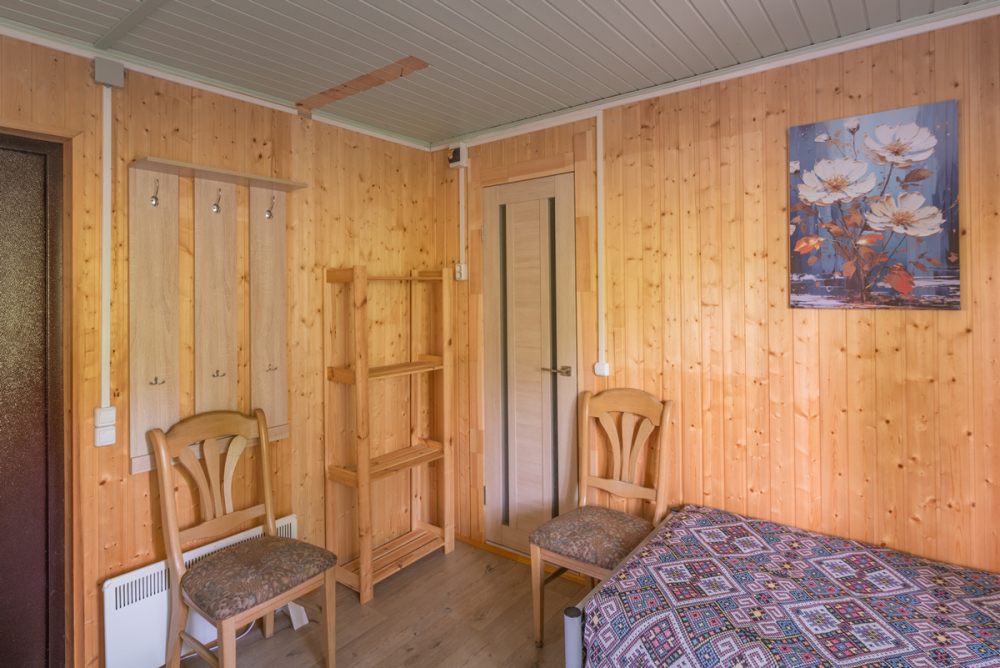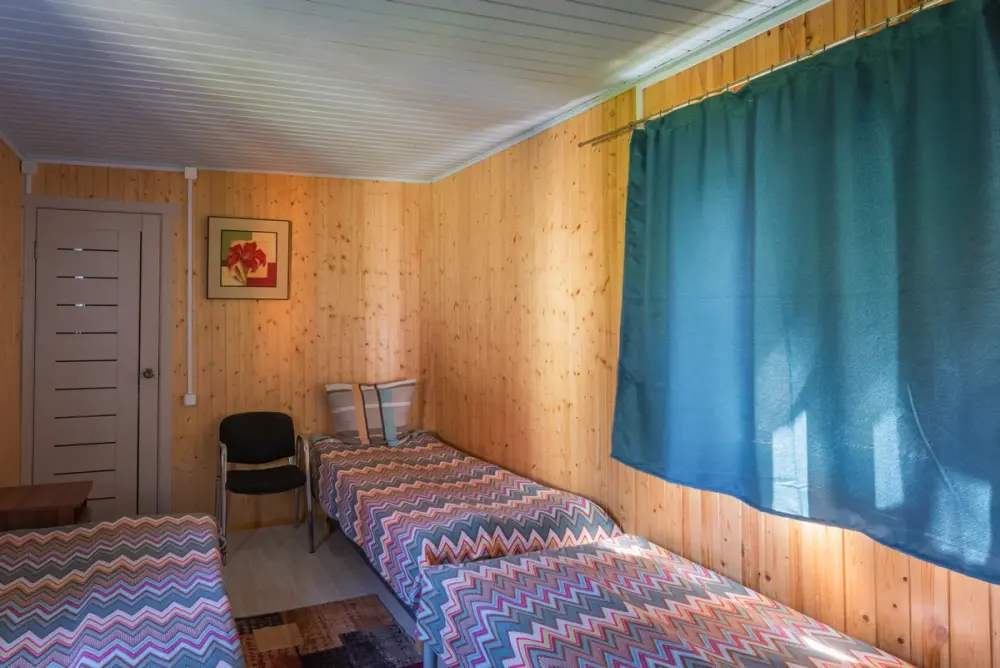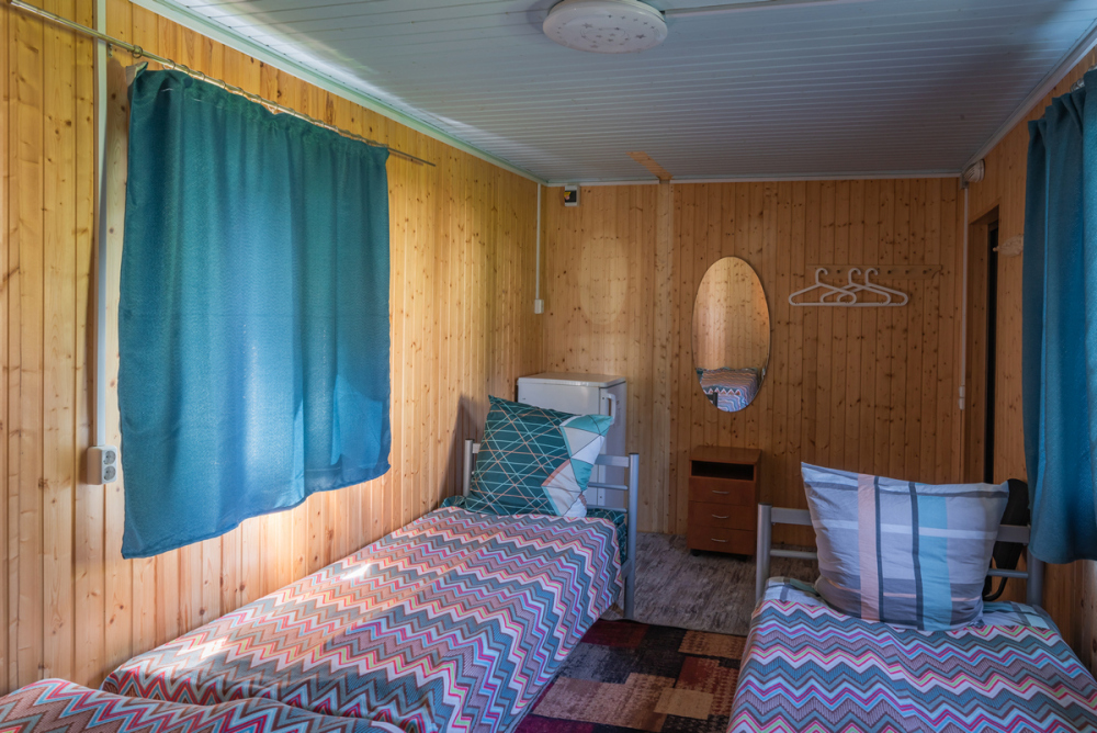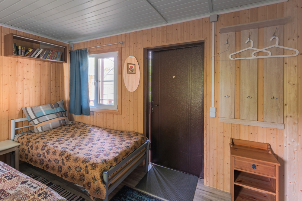 В домике: холодильник, москитная сетка на окнах, обогреватель (при необходимости), полутора спальные кровати, кофеварка, тостер.