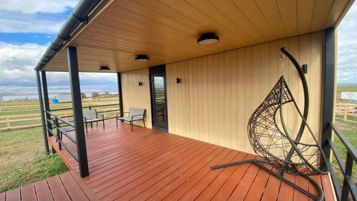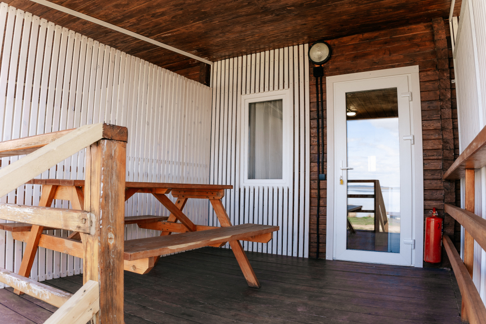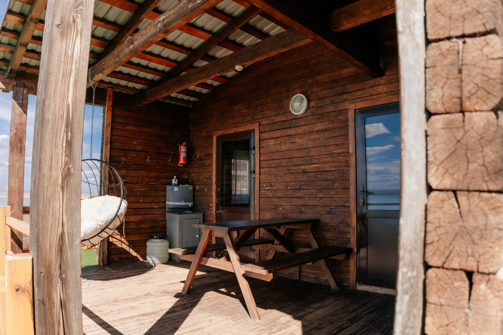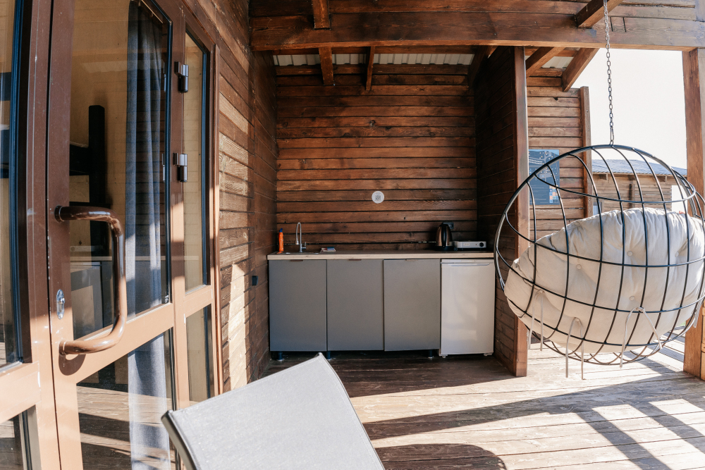 Терраса оборудована качелей и мебелью из натурального дерева — столиком, скамейками. Здесь есть умывальник с емкостью для воды, плитка и посуда.