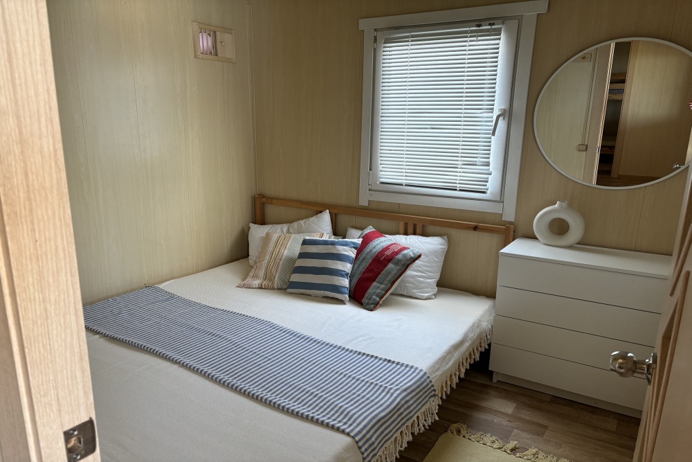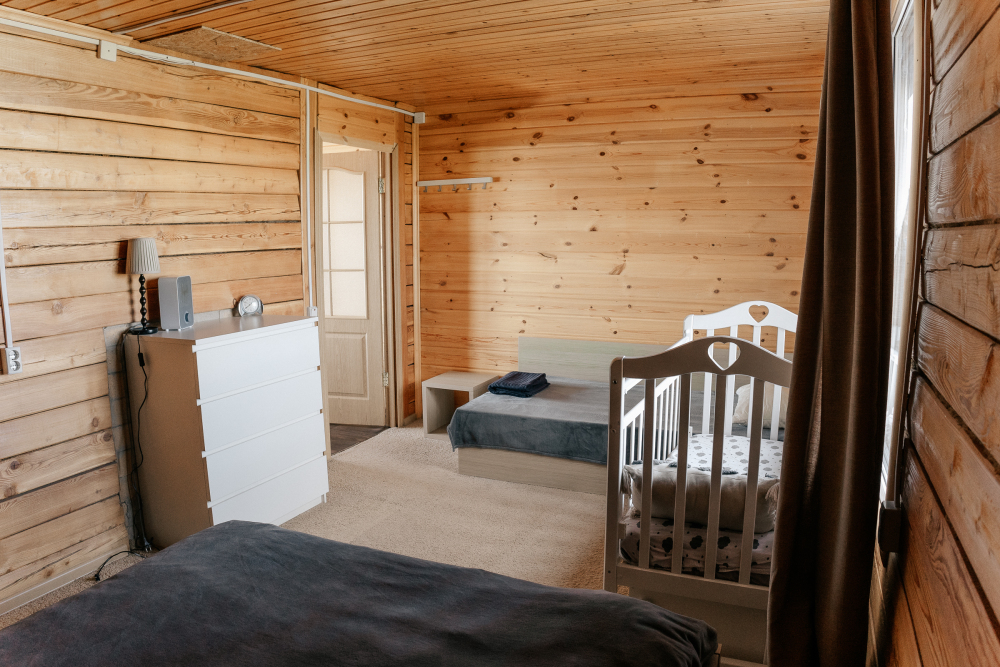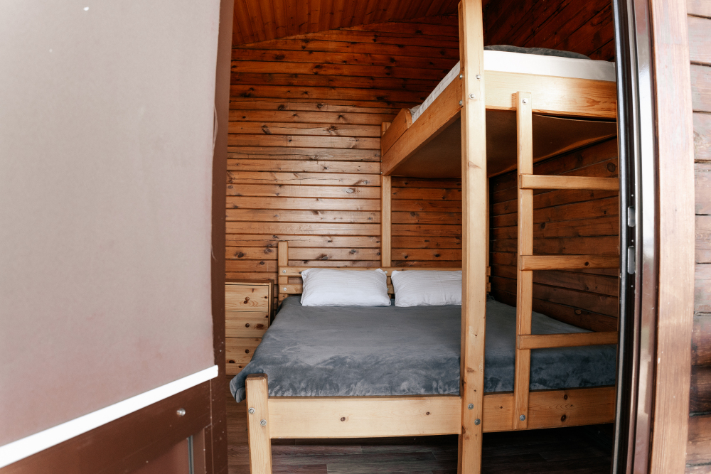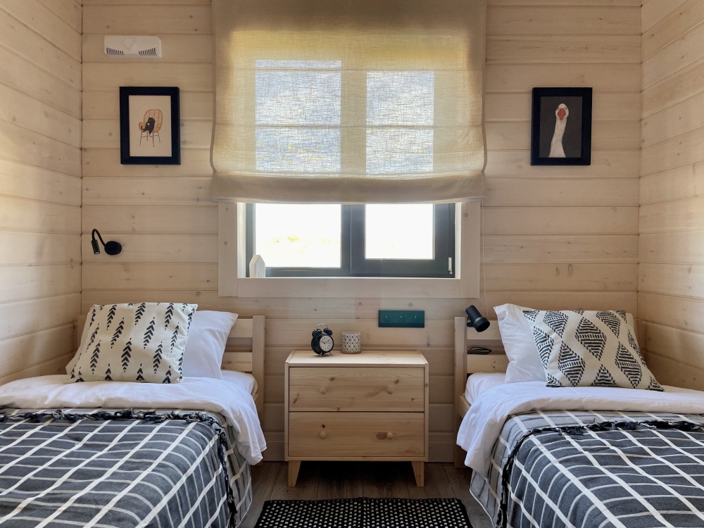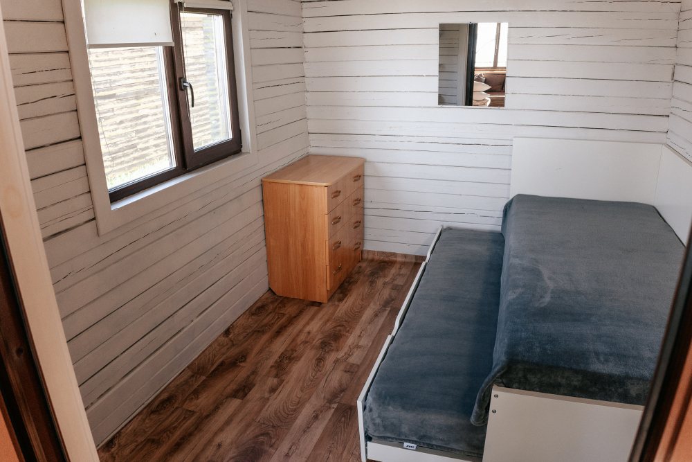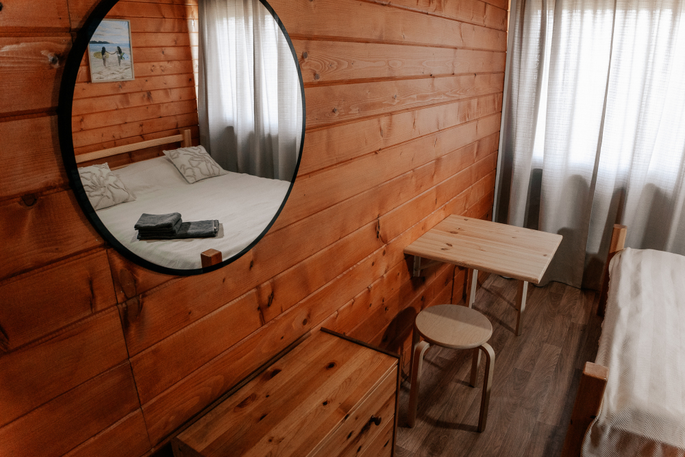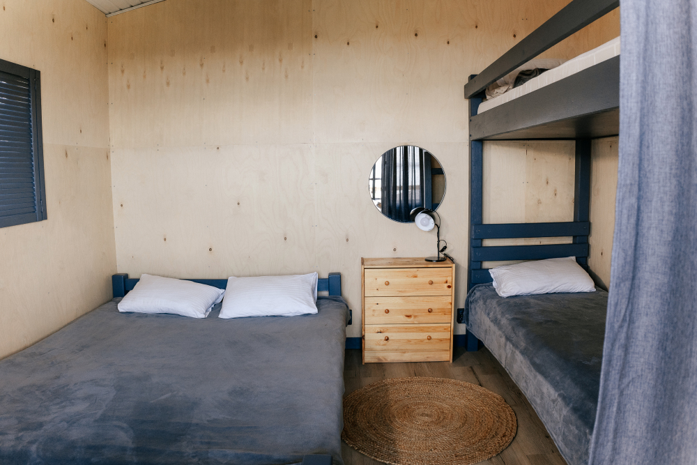 Домик идеально подходит для семейного отдыха с детьми. В комнате расположены большая двуспальная и одна двухъярусная кровати. Есть полки, зеркало, комод и постельные принадлежности.