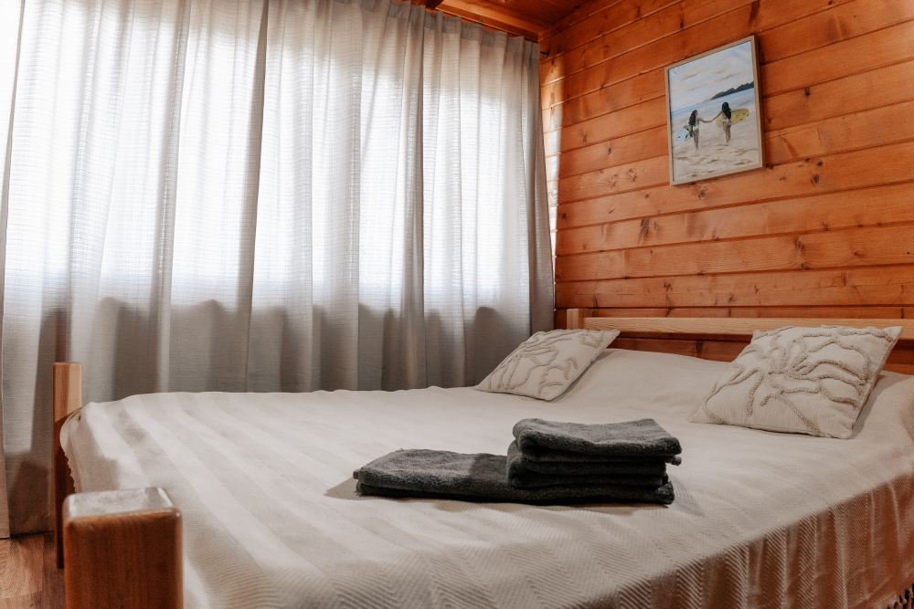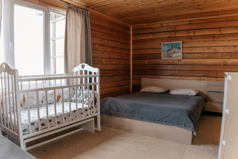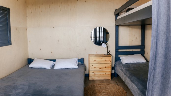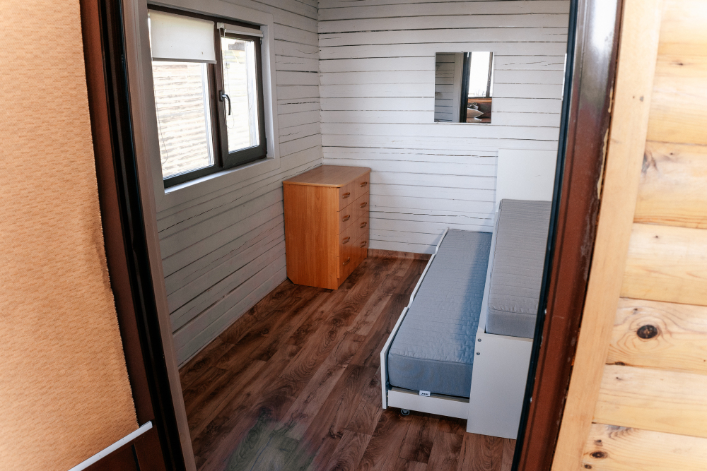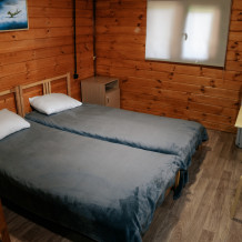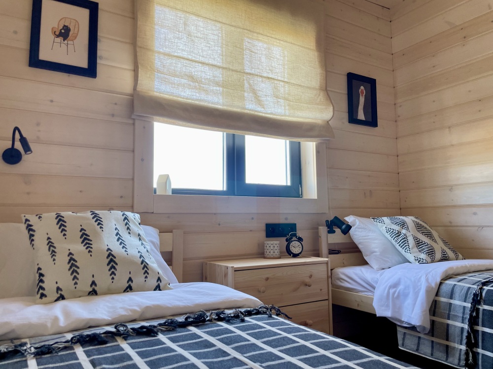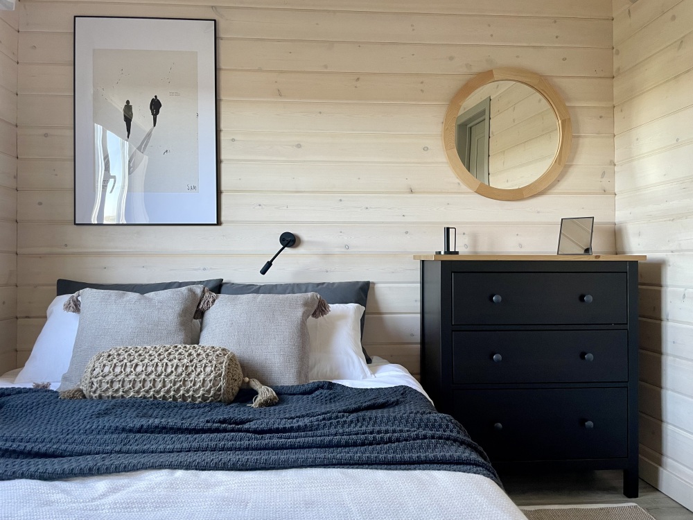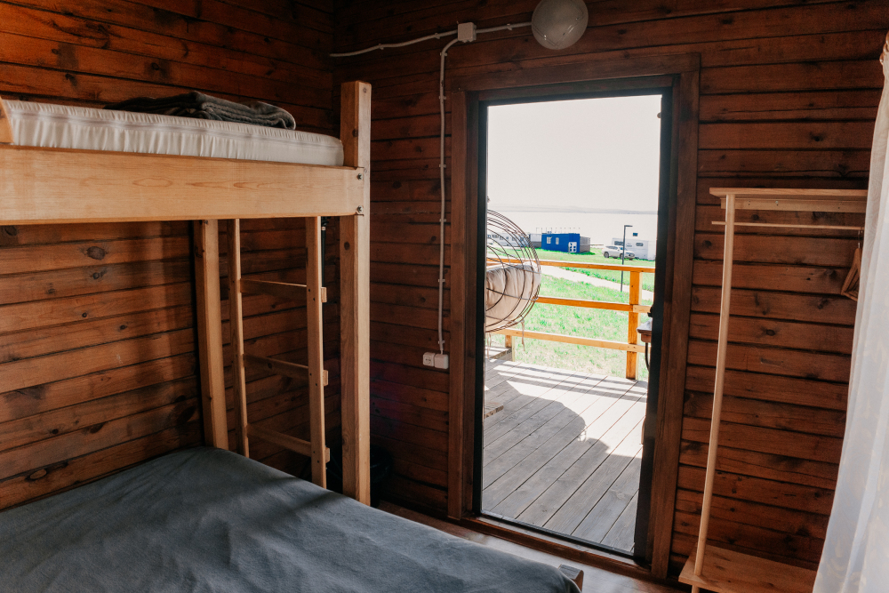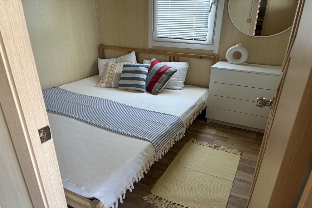 Домик идеально подходит для семейного отдыха с детьми. В комнате расположены большая двуспальная и одна двухъярусная кровати. Есть полки, зеркало, комод и постельные принадлежности.