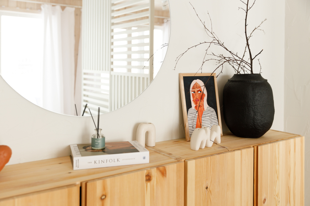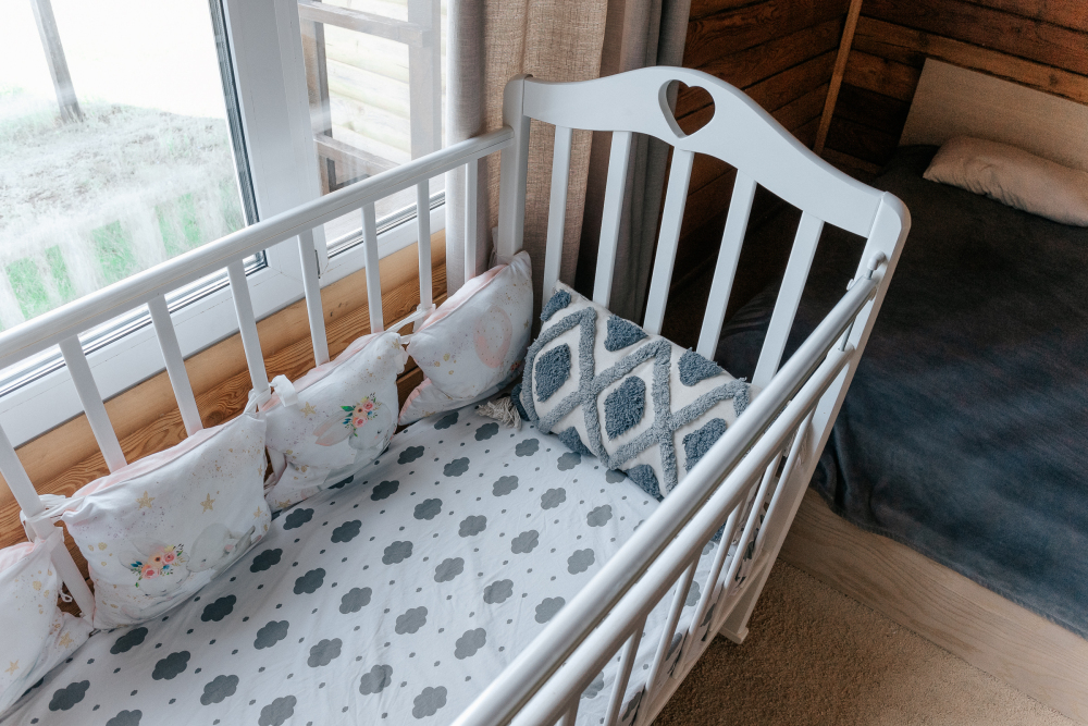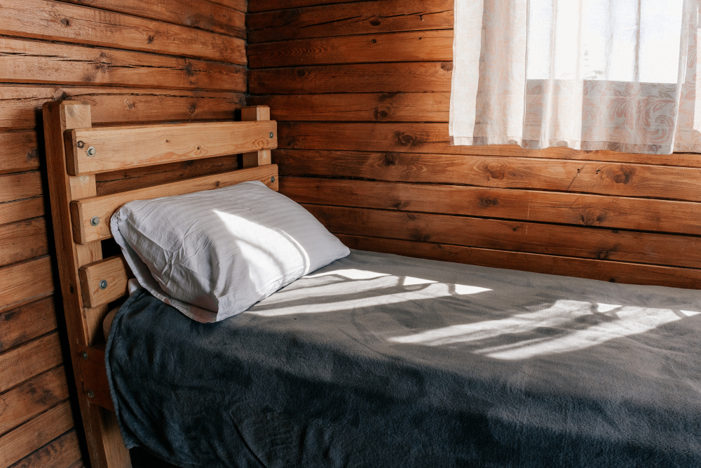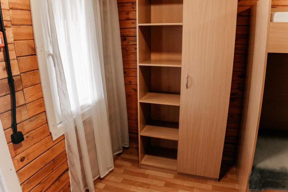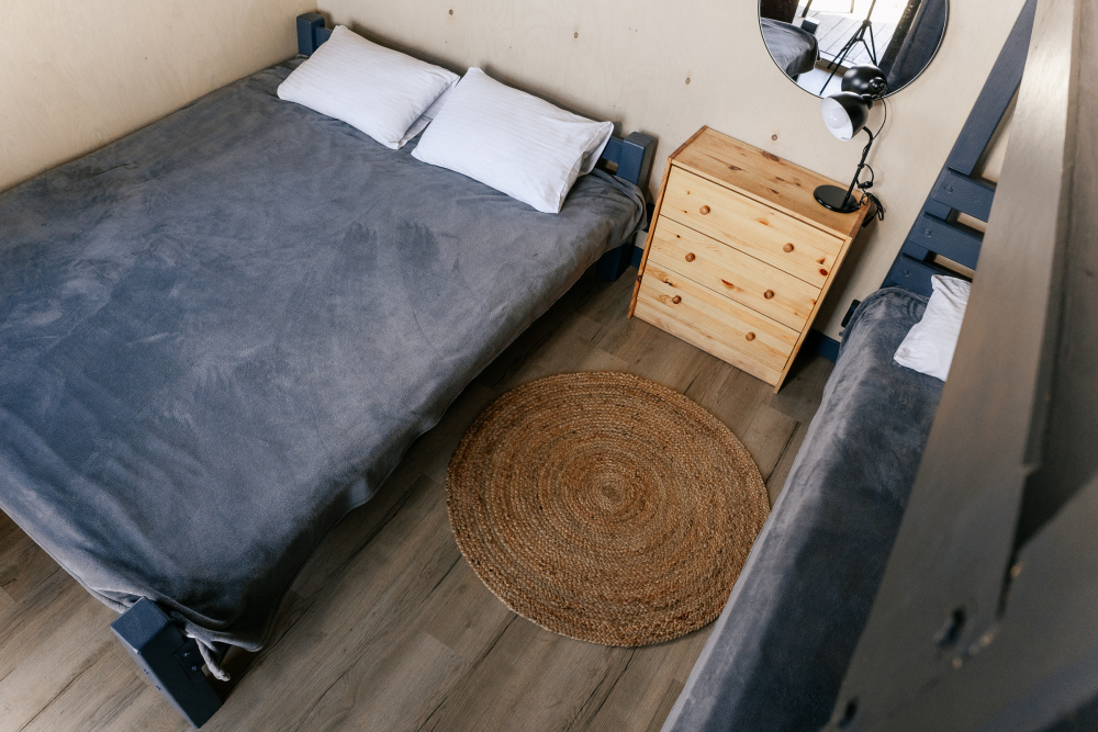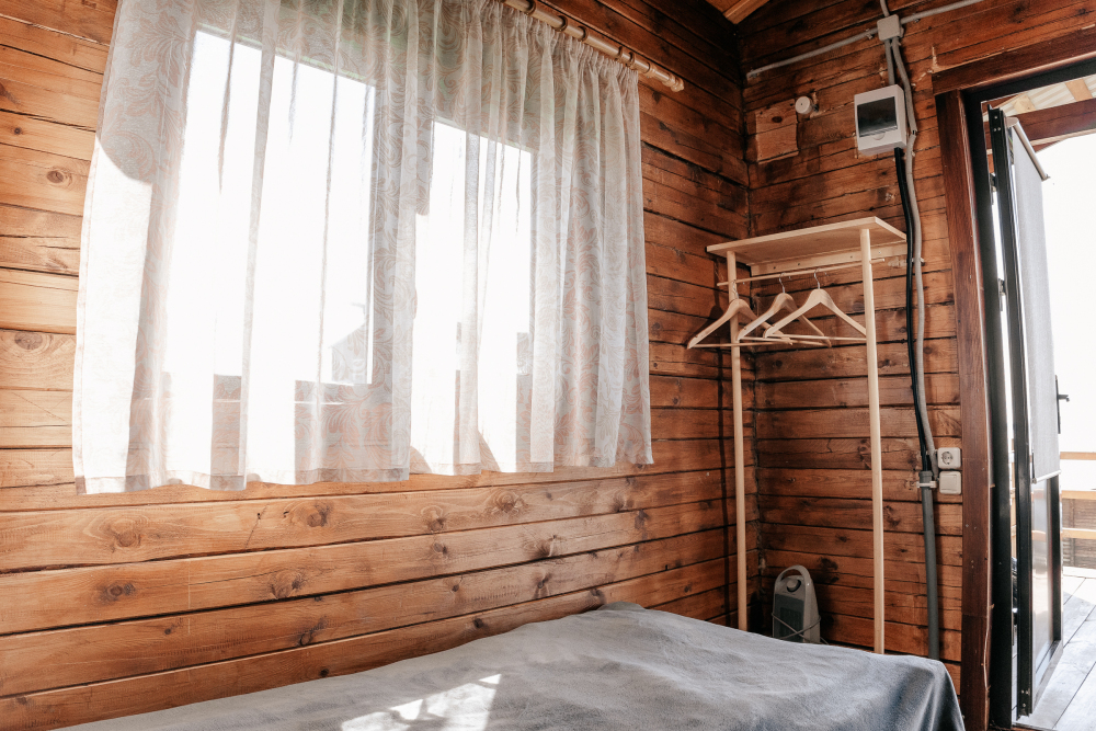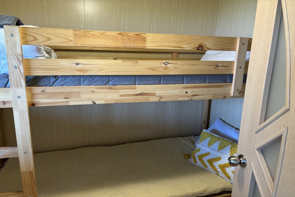 Домик идеально подходит для семейного отдыха с детьми. В комнате расположены большая двуспальная и одна двухъярусная кровати. Есть полки, зеркало, комод и постельные принадлежности.