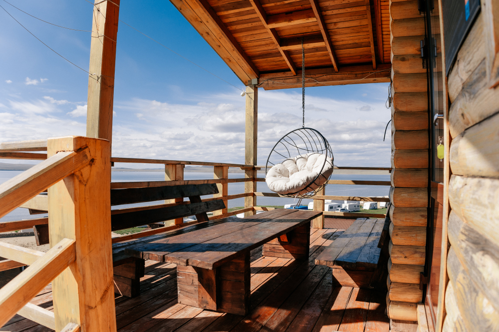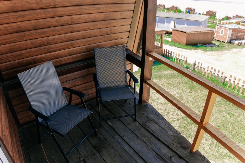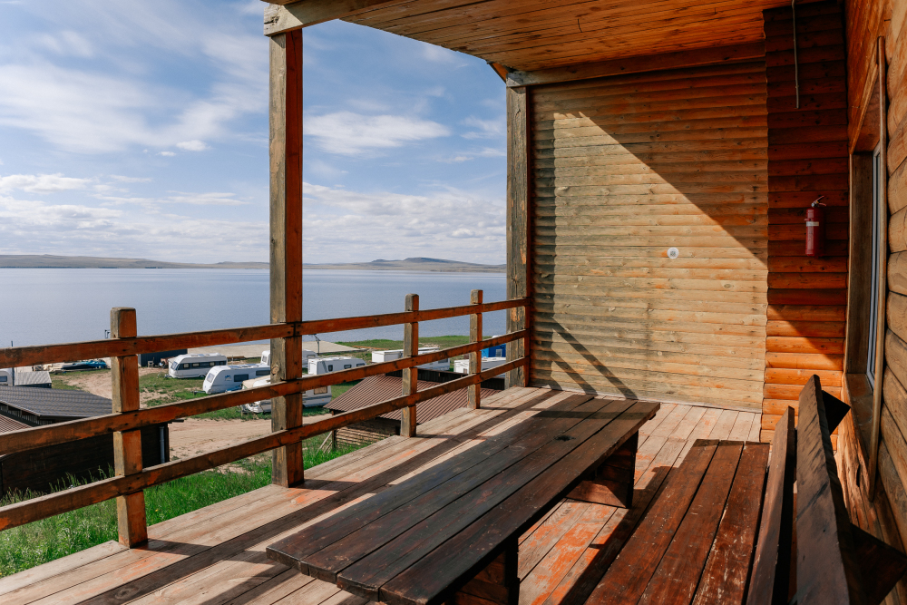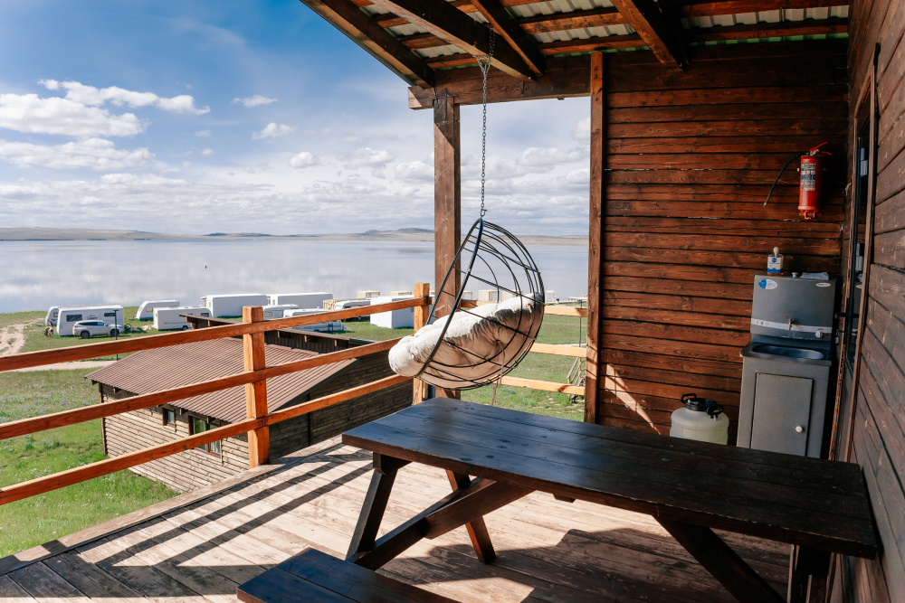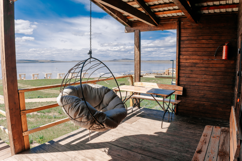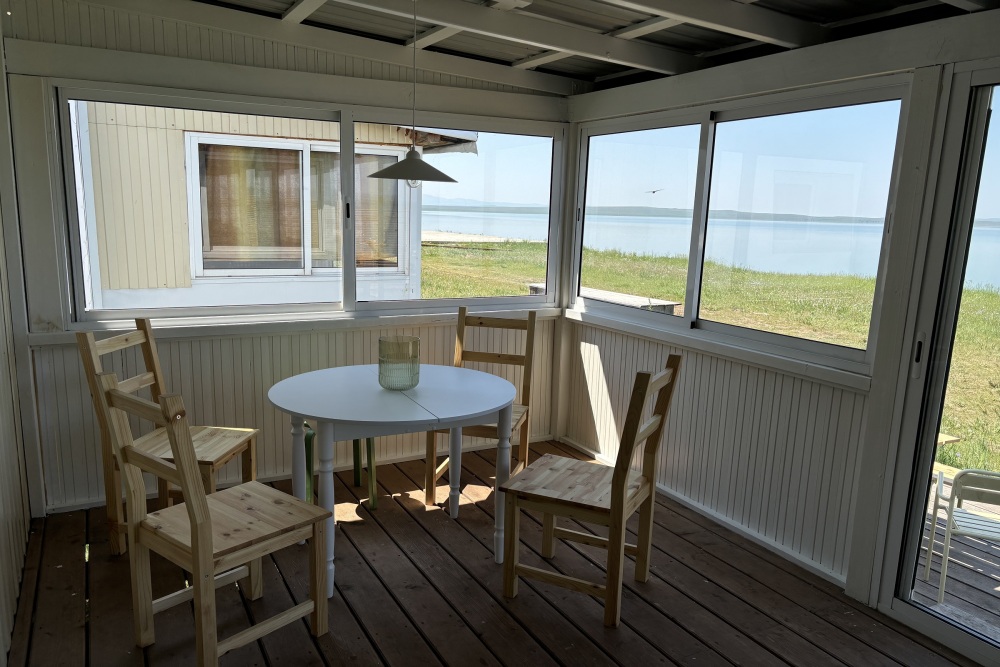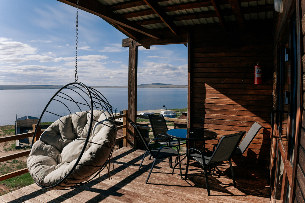 Терраса с видом на озеро оборудована удобной мебелью.