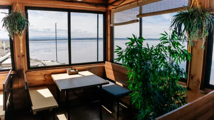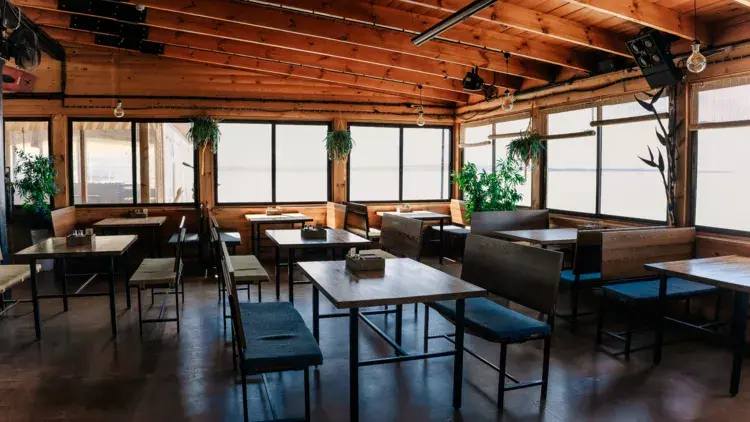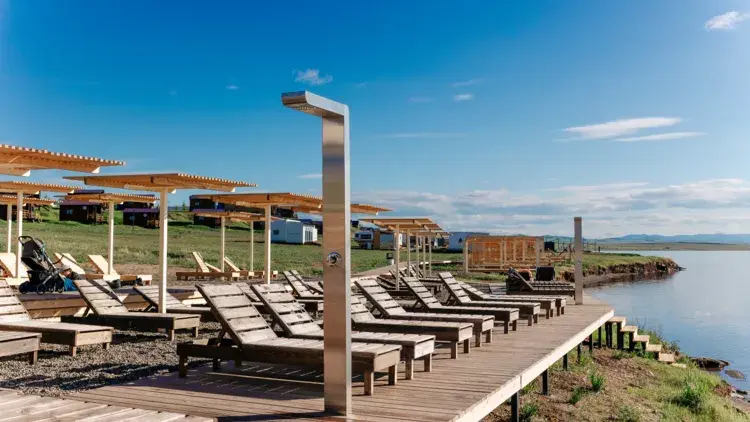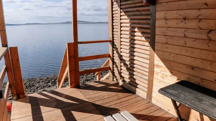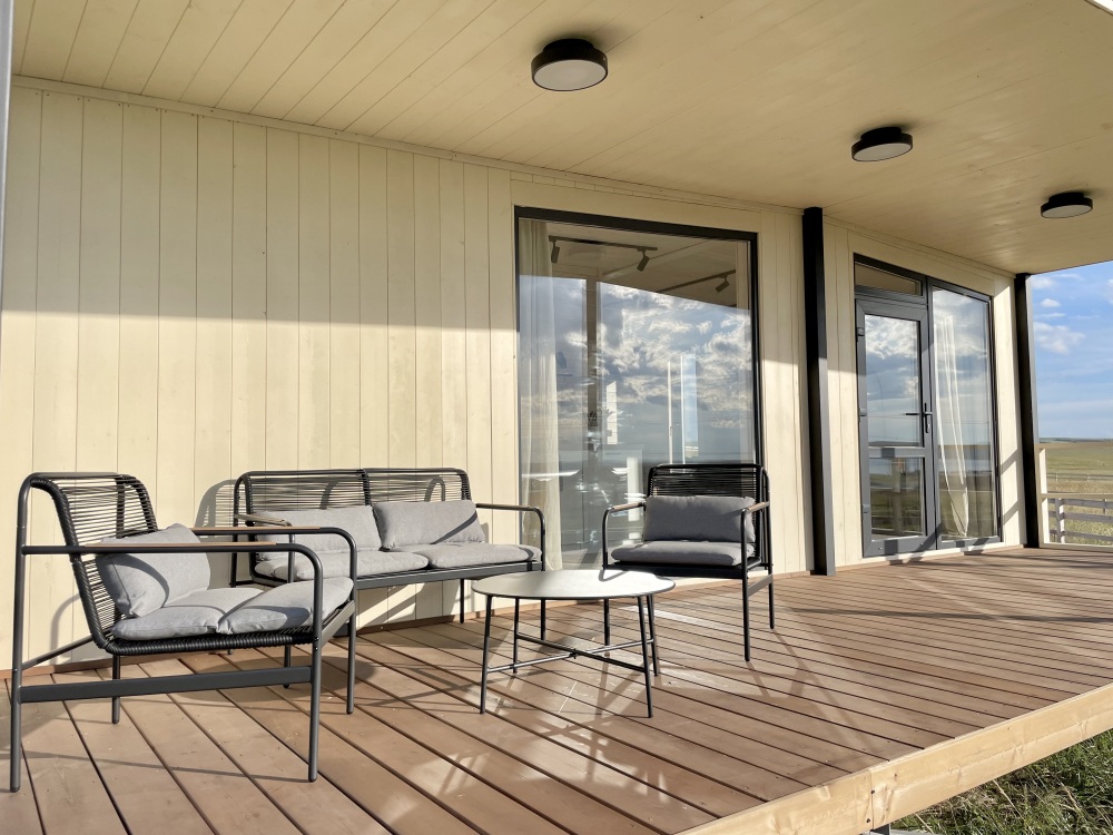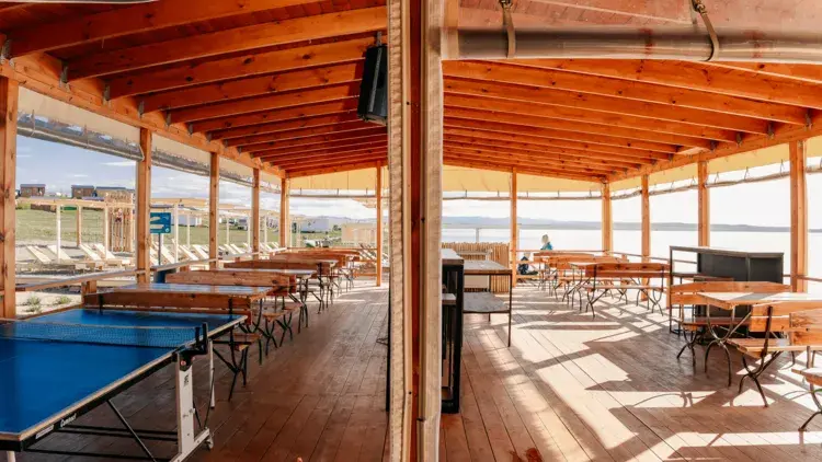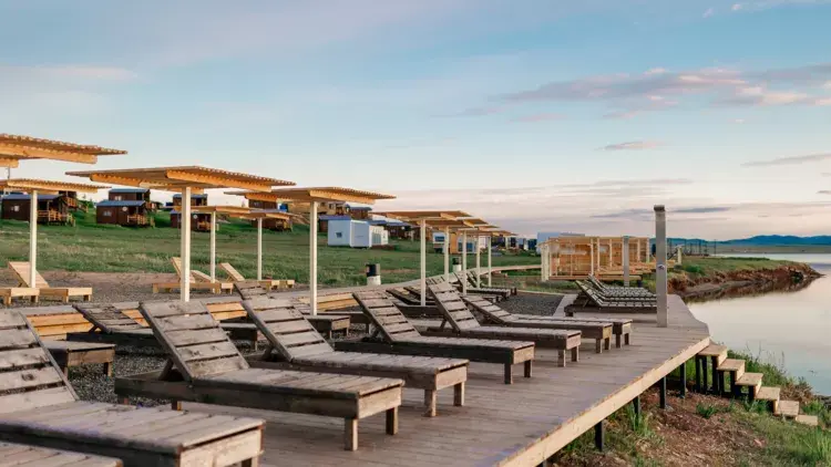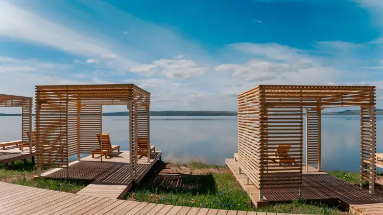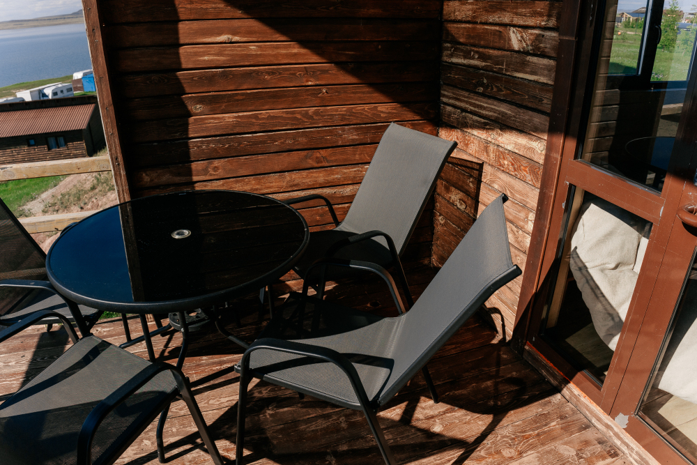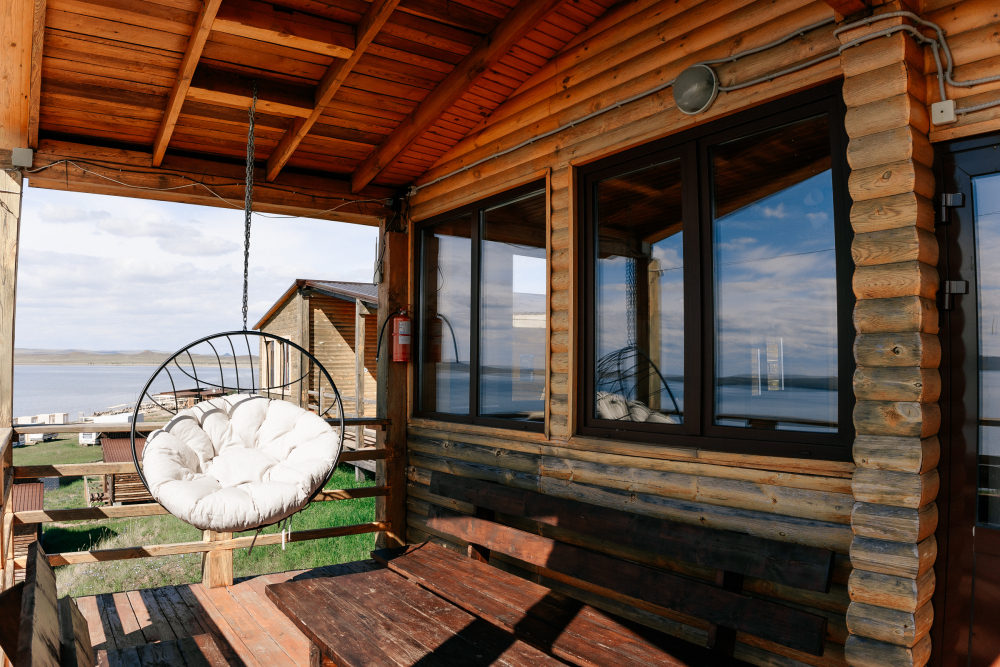 Терраса с видом на озеро оборудована удобной мебелью.