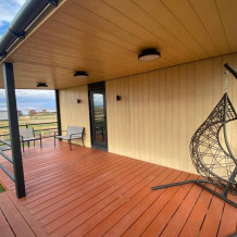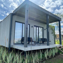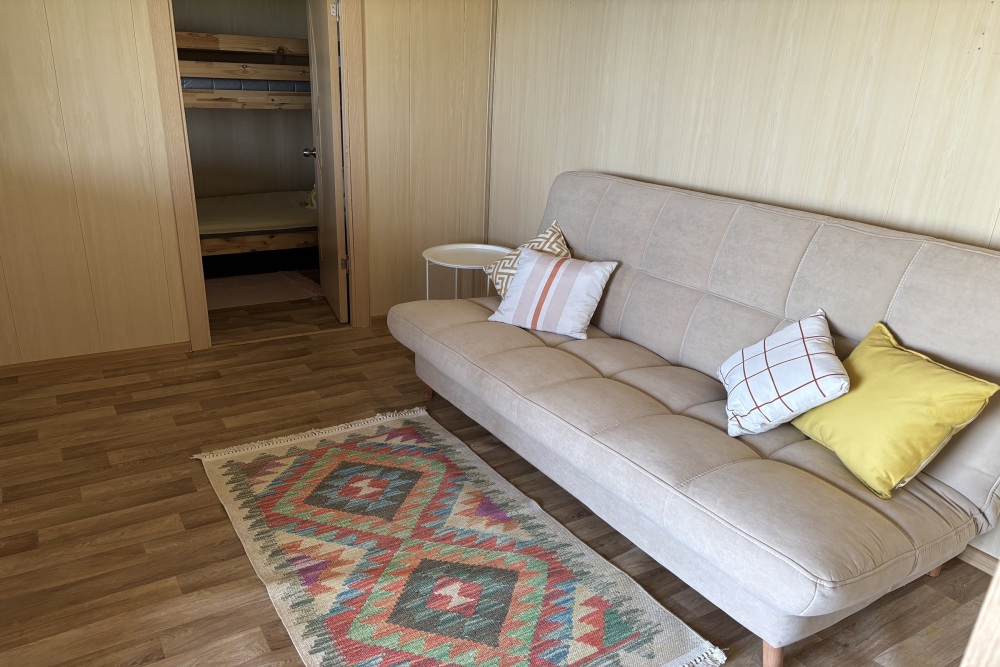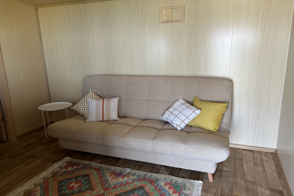 Комфортный 4-х местный домик идеально подойдет для отдыха семьей или небольшой компанией. Закрытая веранда оборудована большим уютным диваном, шкафом и телевизором.