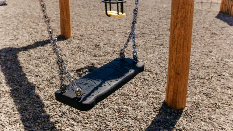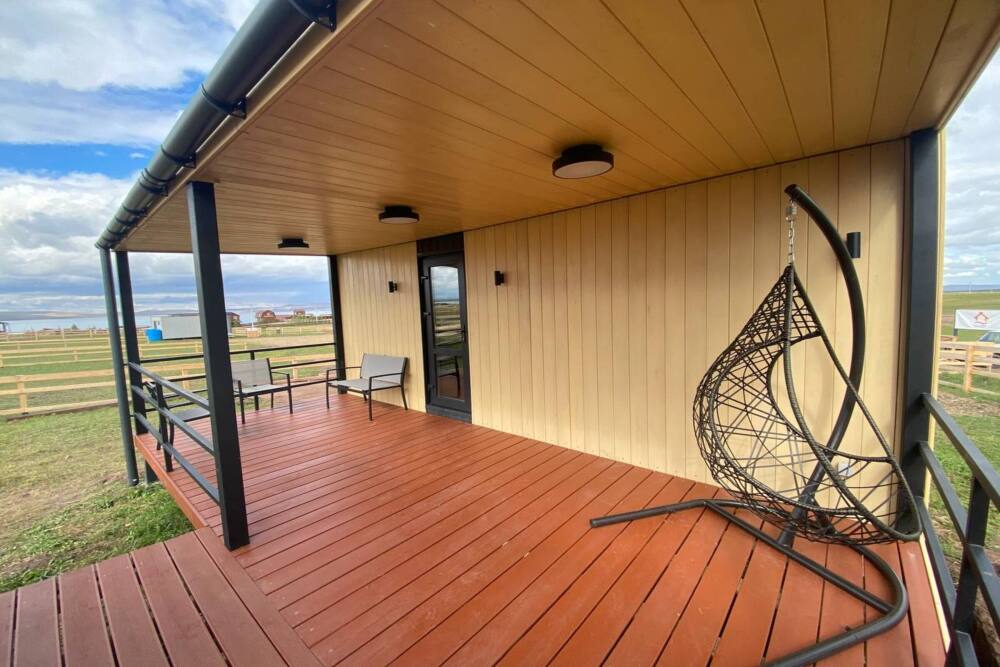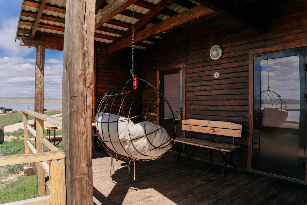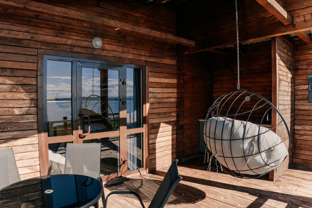 Терраса с видом на озеро оборудована качелей и мебелью — столиком, стульями и кухонной зоной с холодильником, чайником, плиткой и посудой.