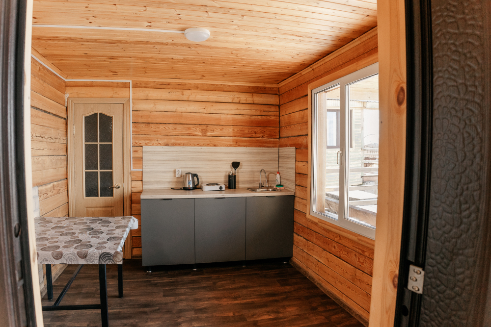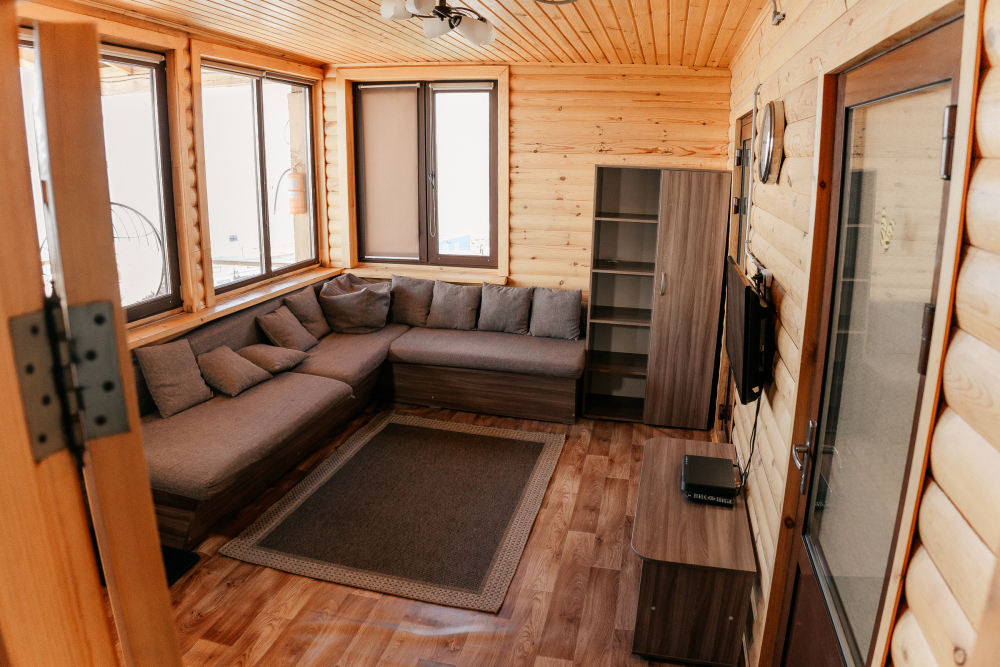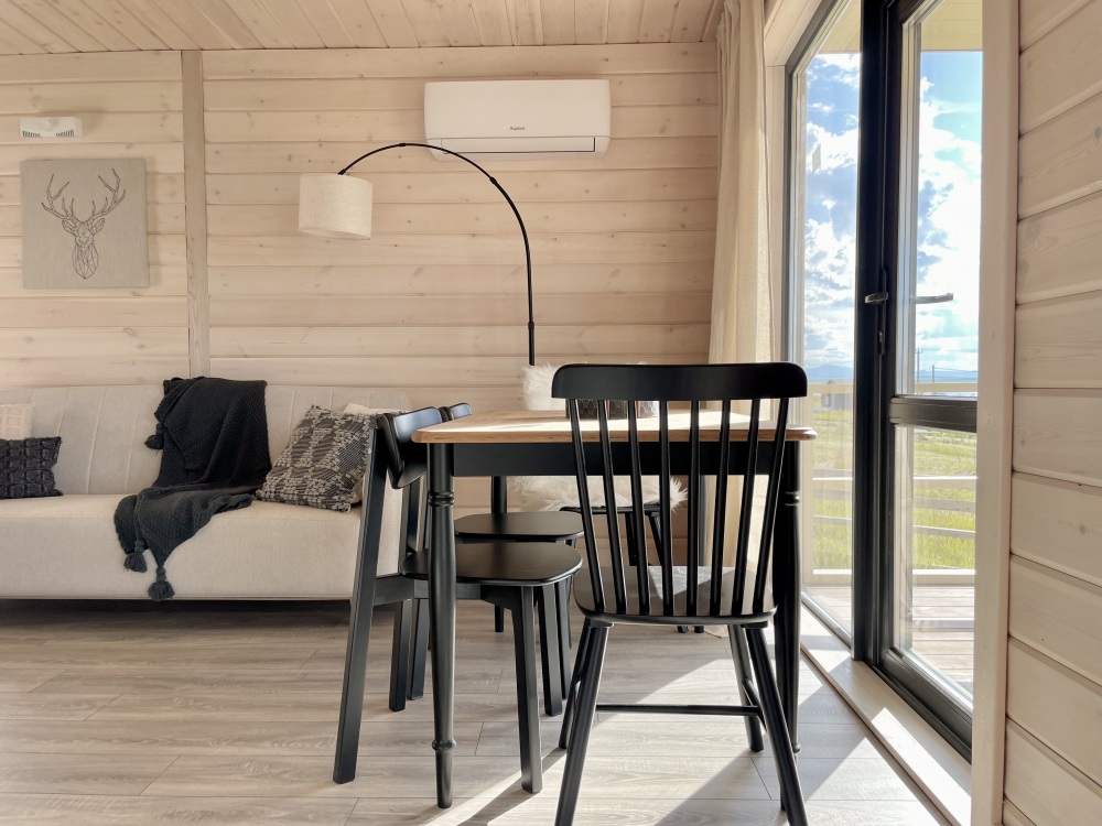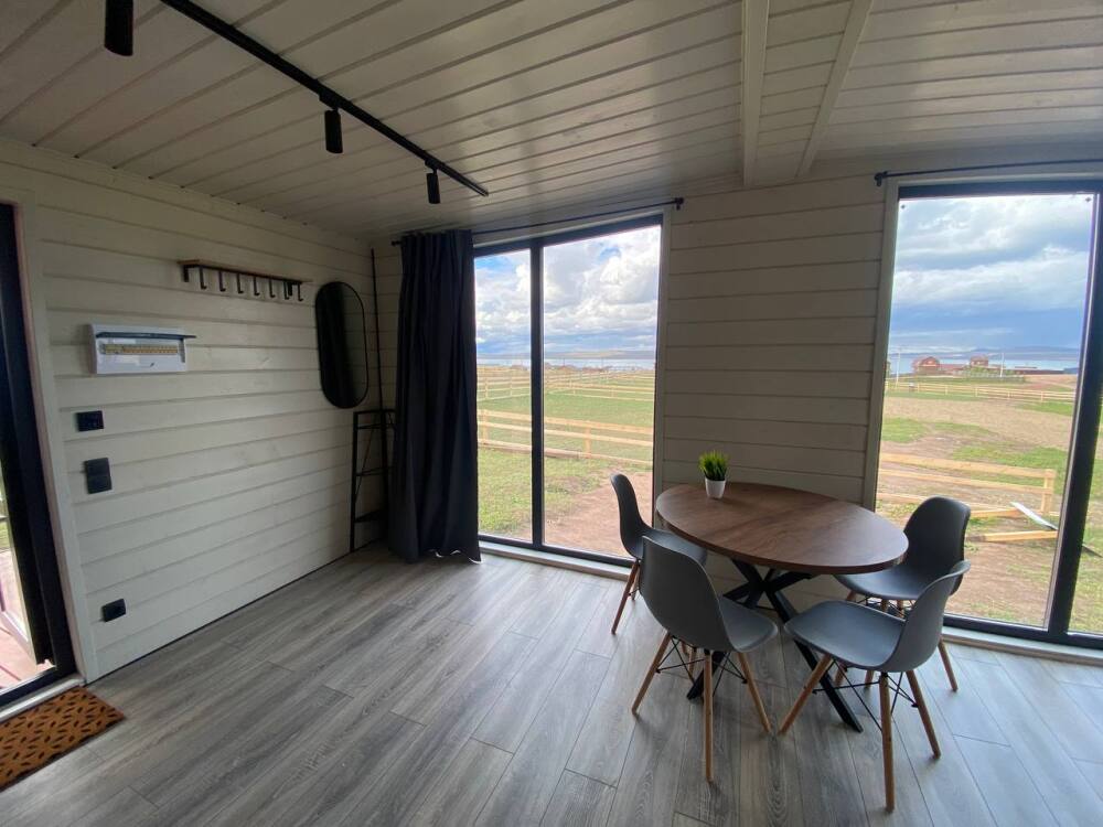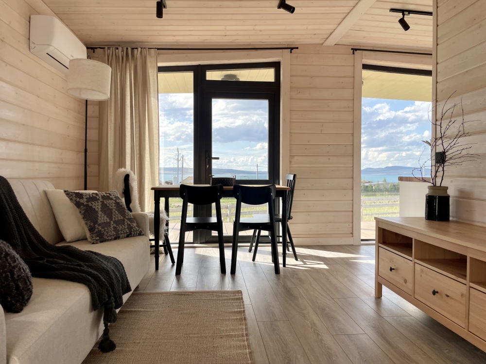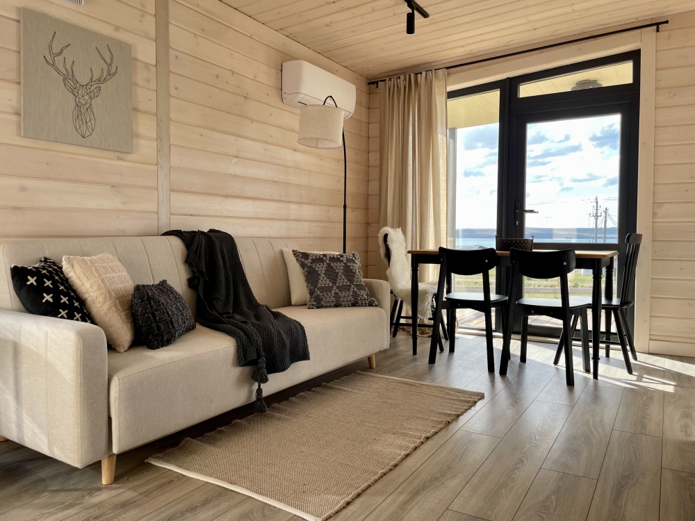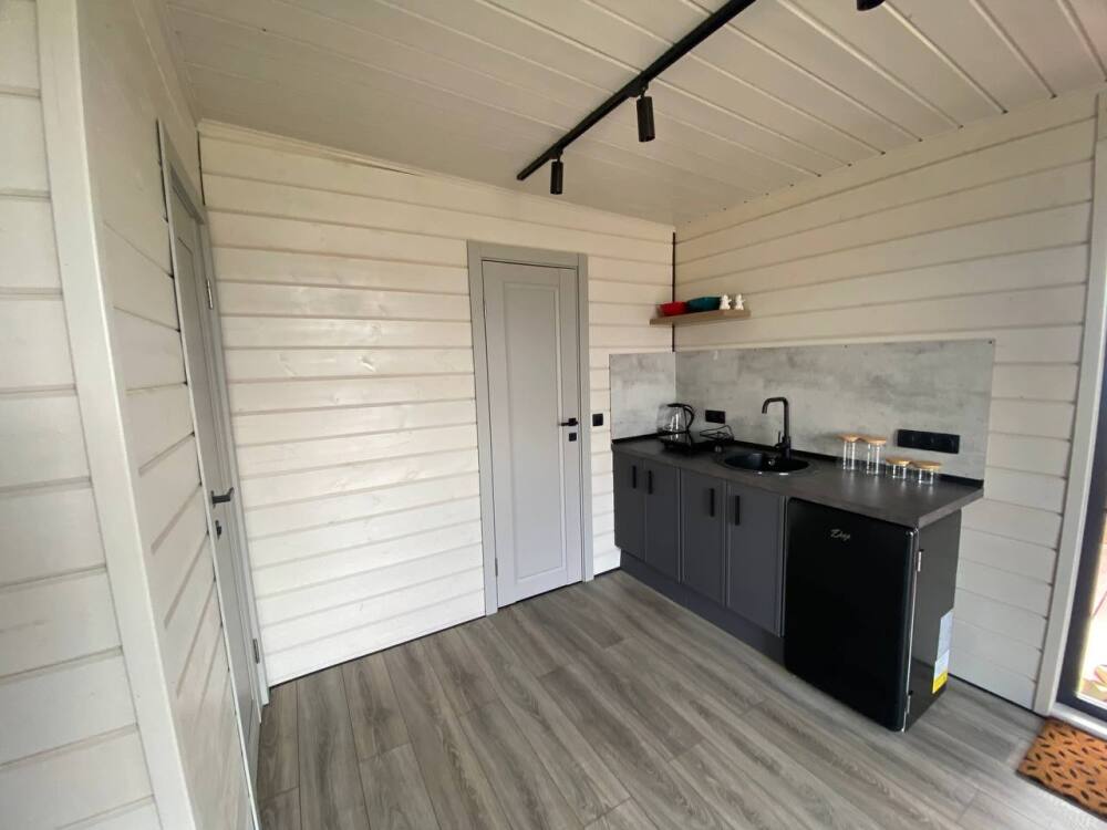 В гостиной оборудована кухня с встроенным холодильником, индукционной плитой и большой зоной готовки. Кондиционера в домике нет. Проживание с животными в данной категории запрещено.