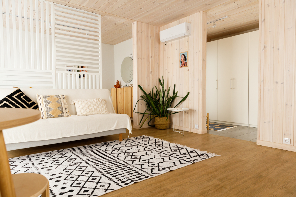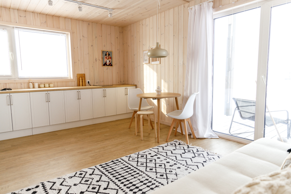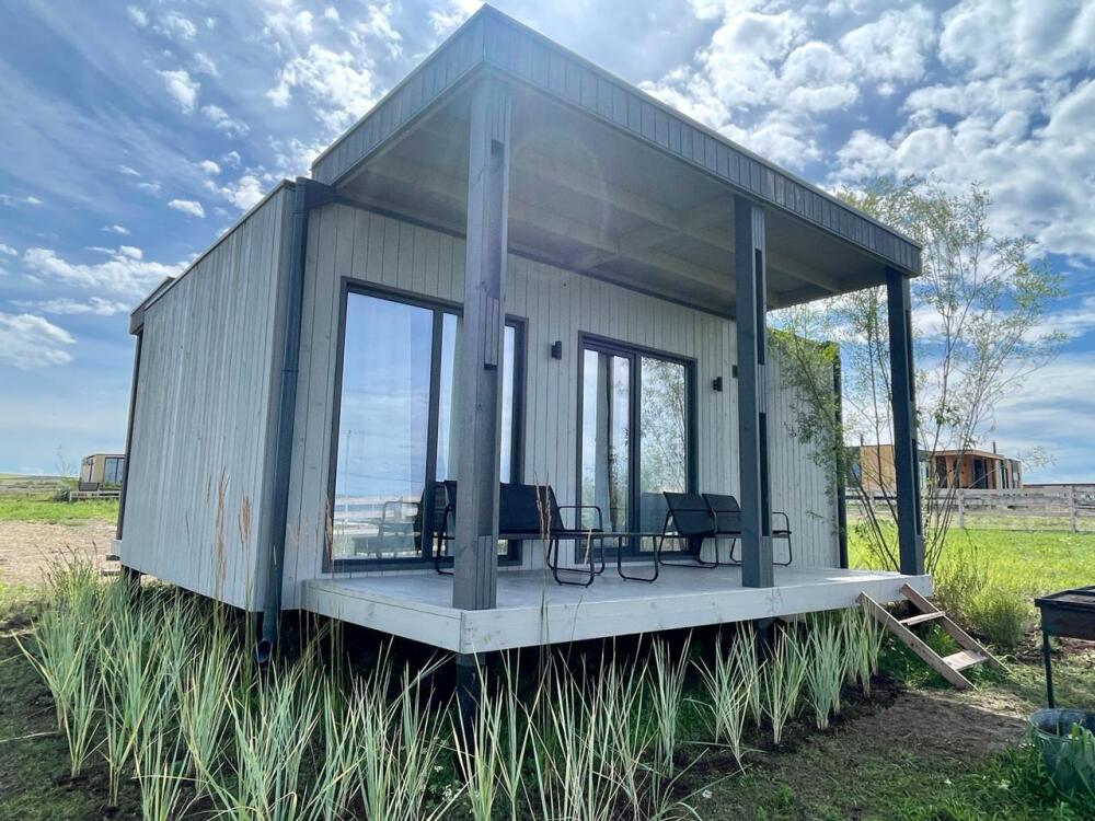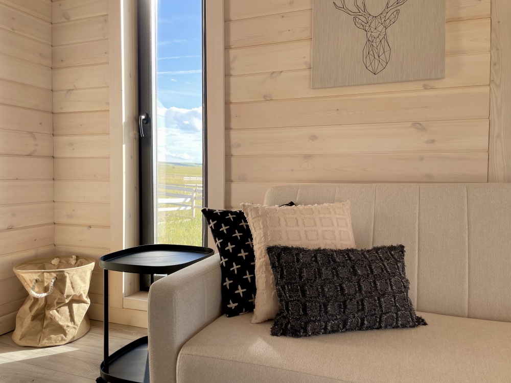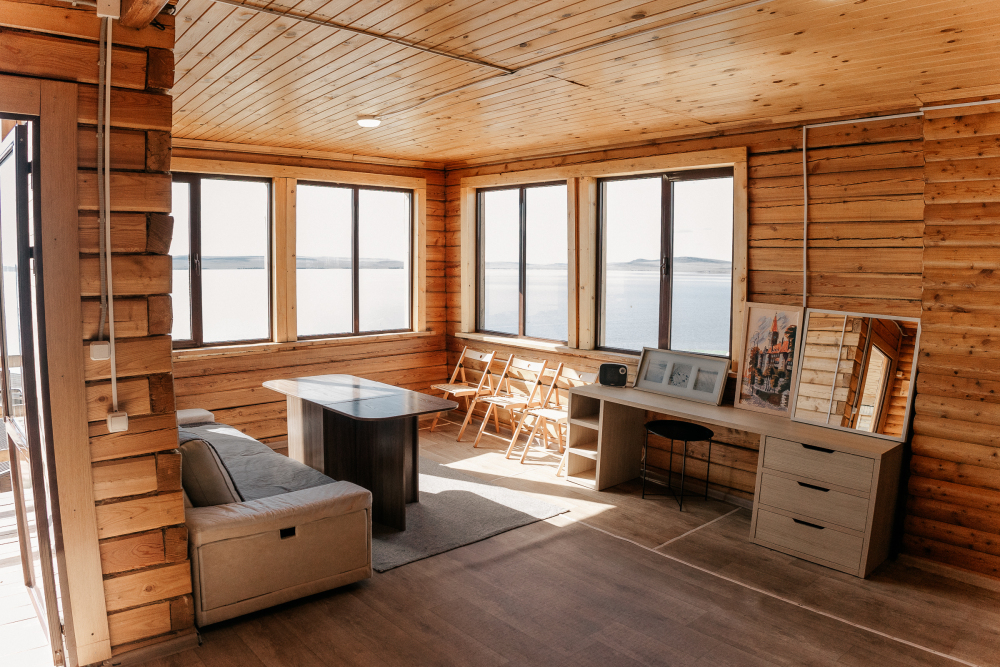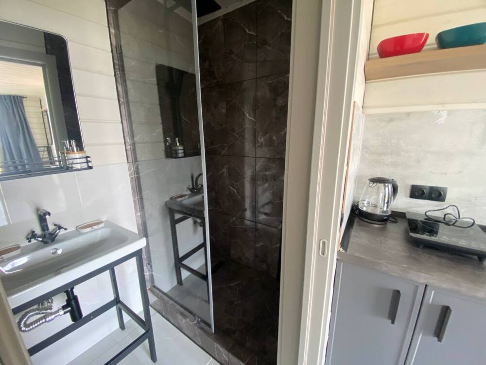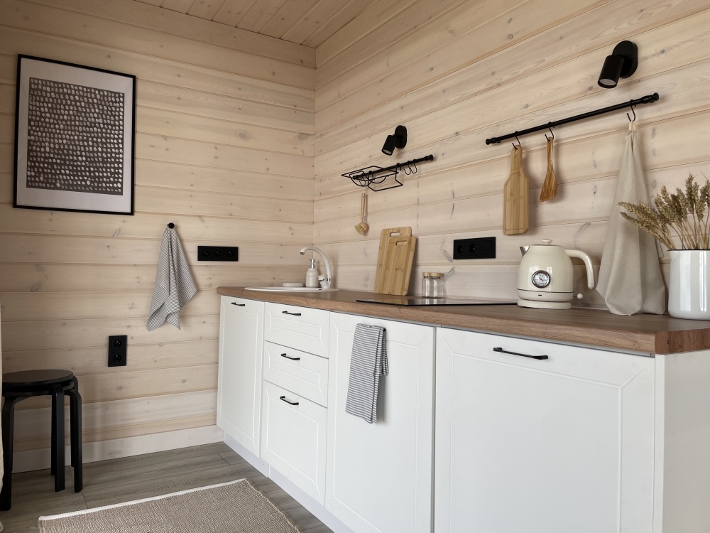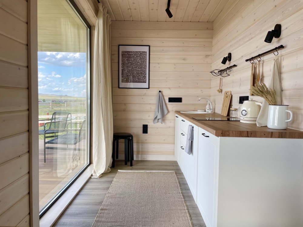В гостиной оборудована кухня с встроенным холодильником, индукционной плитой и большой зоной готовки. Кондиционера в домике нет. Проживание с животными в данной категории запрещено.
