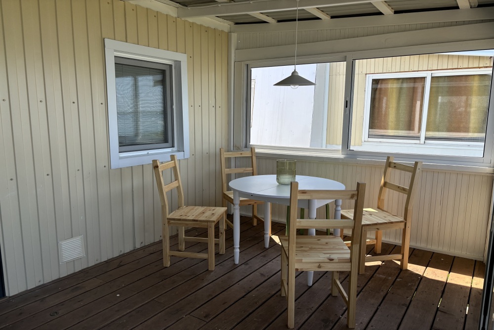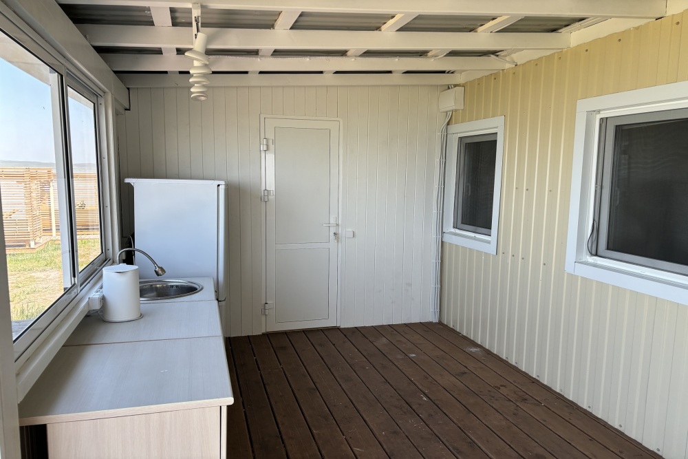 Закрытая веранда оборудована обеденным столом и стульями. Здесь есть раковина с холодной водой, шкафчики, холодильник, плитка, чайник и посуда.