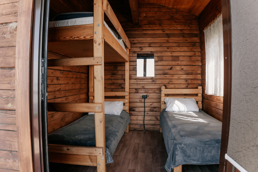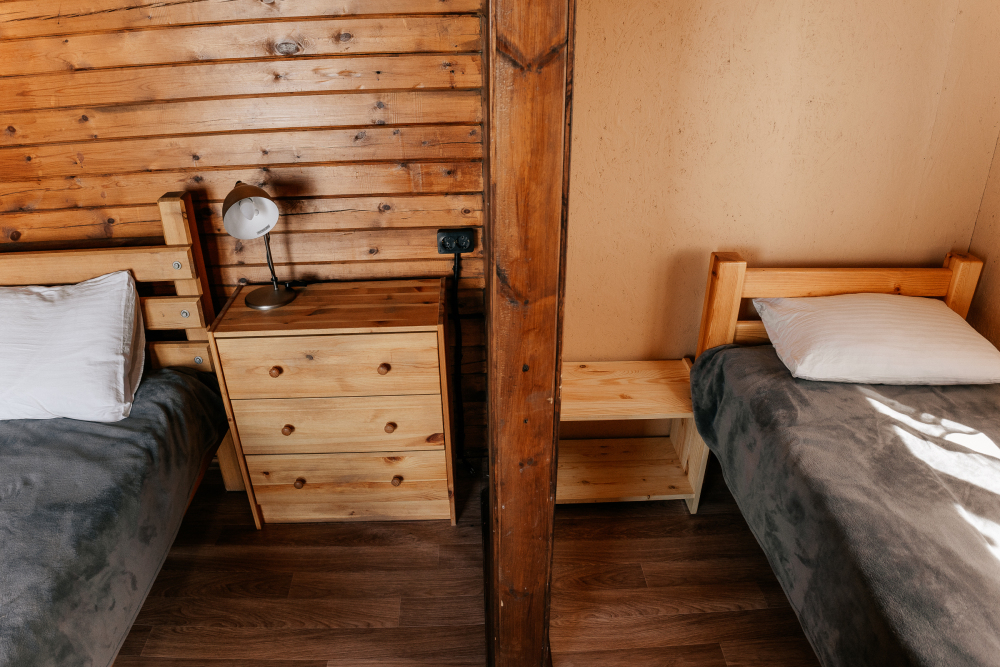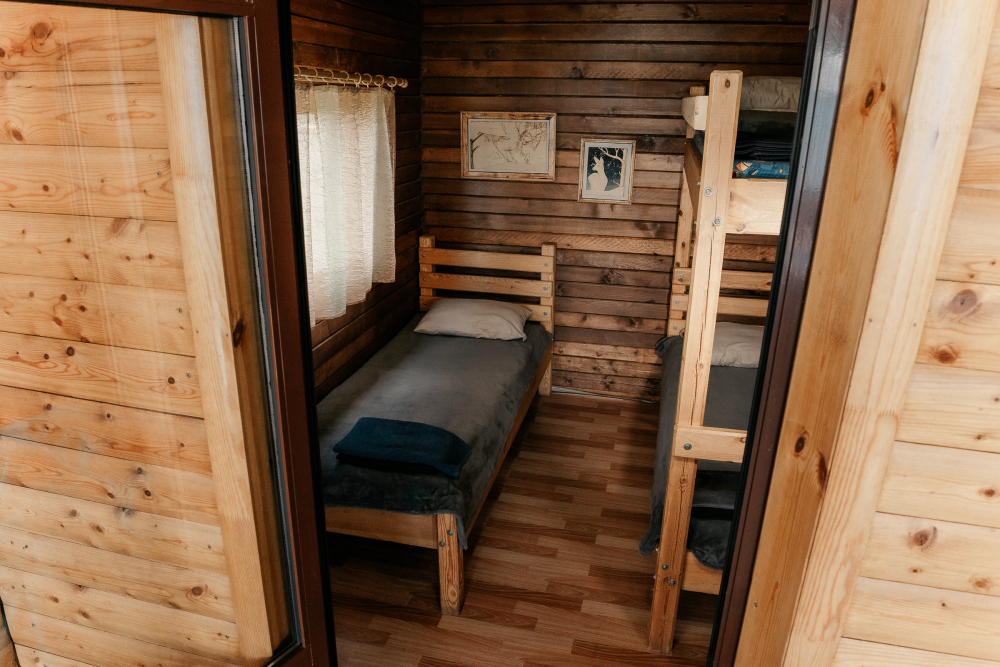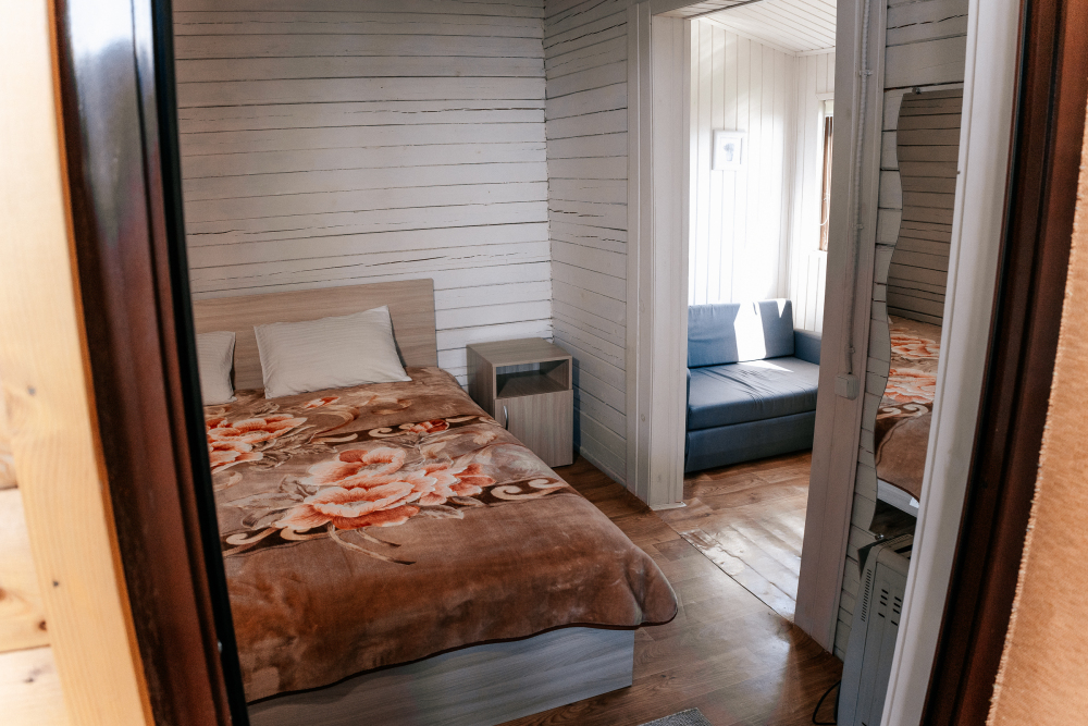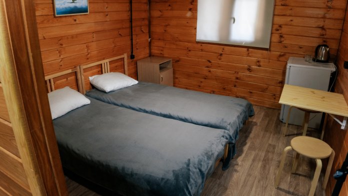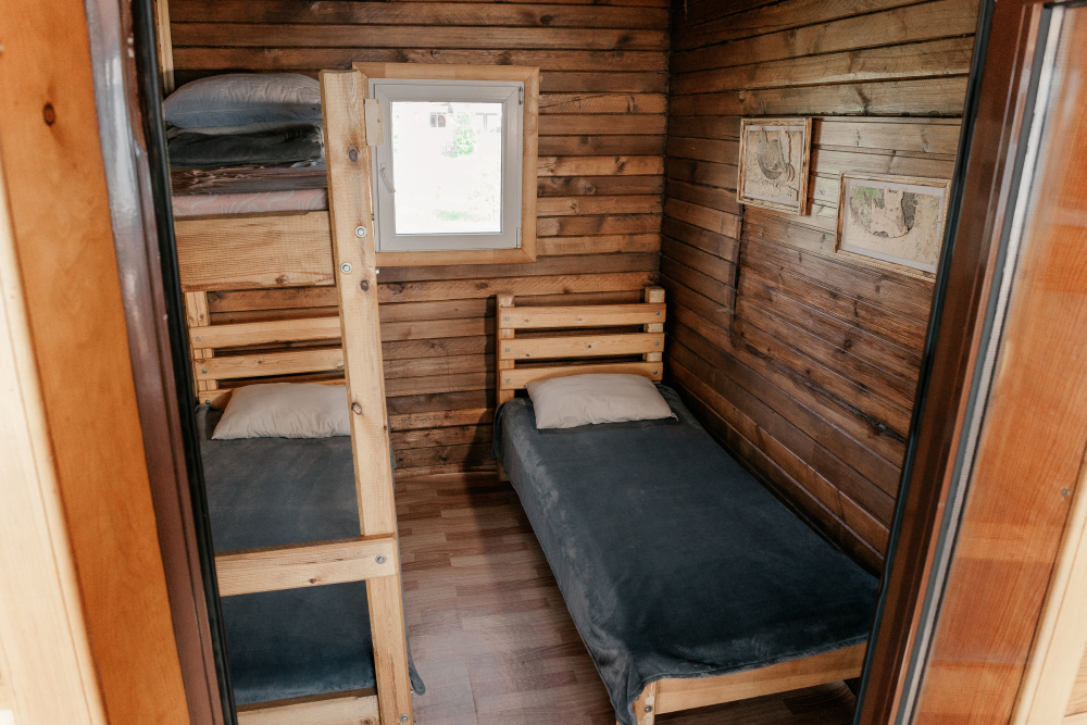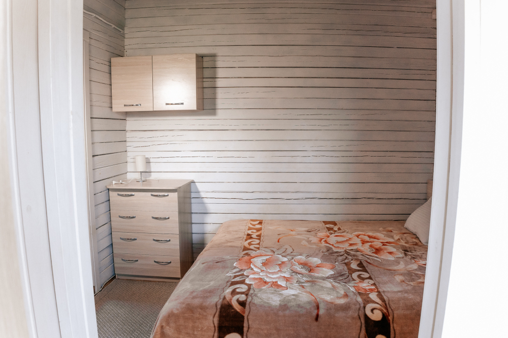 В каждой спальне расположены кровати — односпальная, двуспальная и двухъярусная. Также для удобства гостей в комнатах есть полки, зеркало, холодильник, чайник, плитка, посуда и постельные принадлежности.