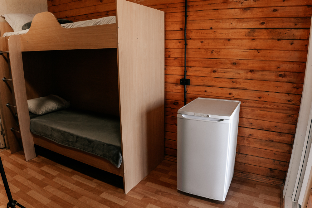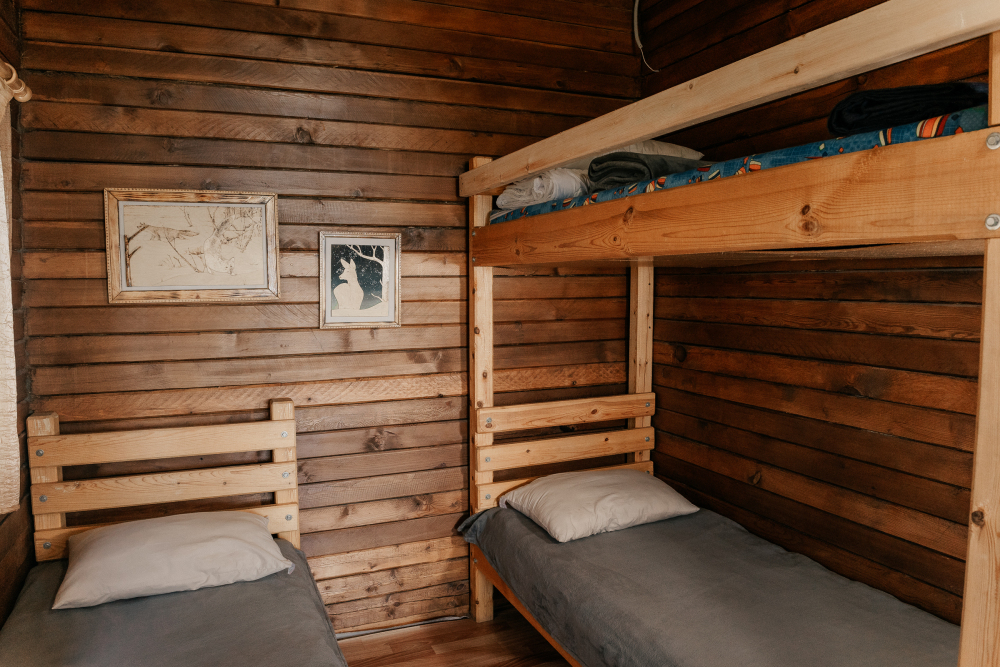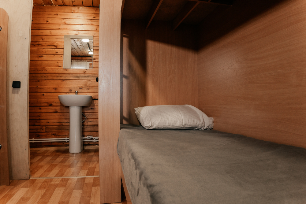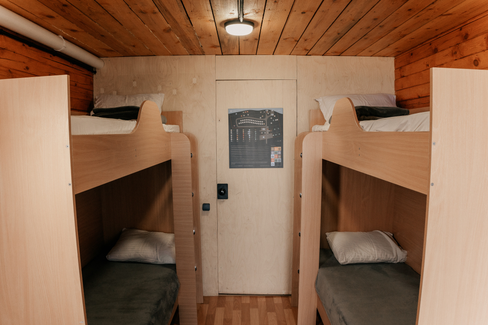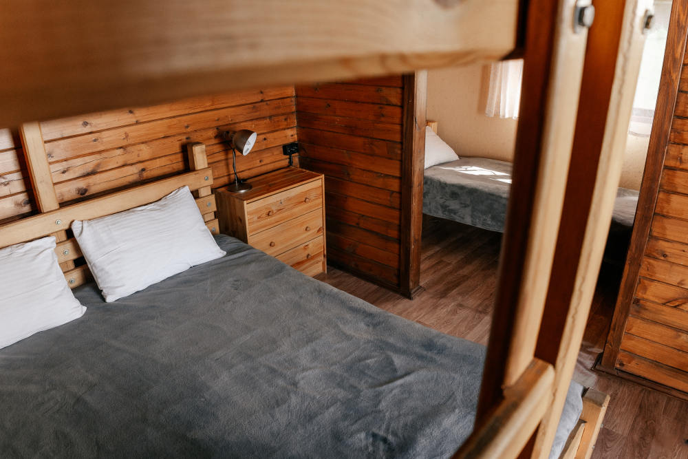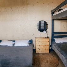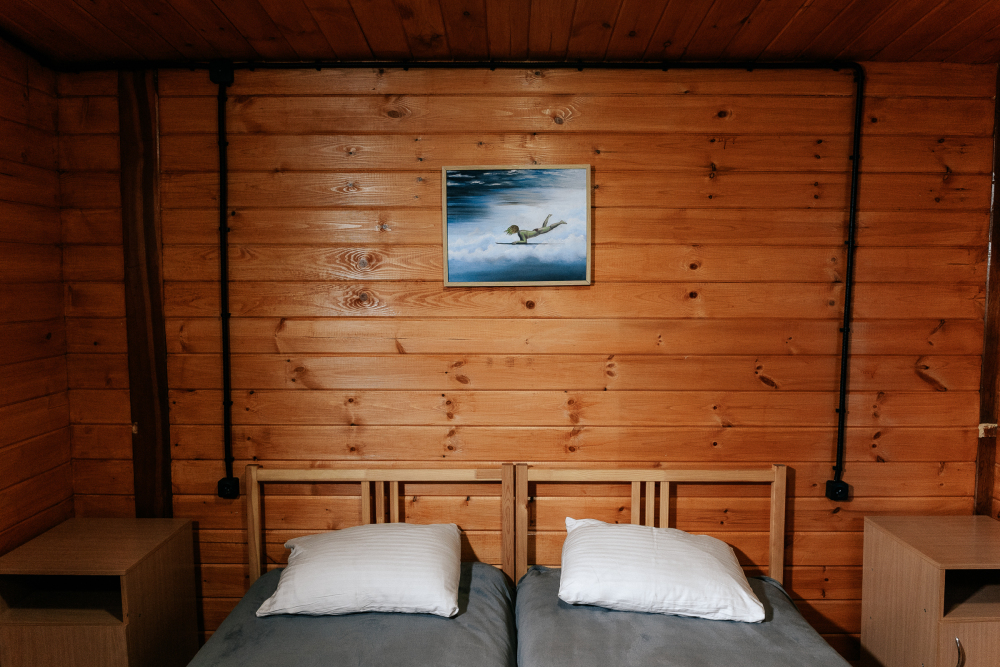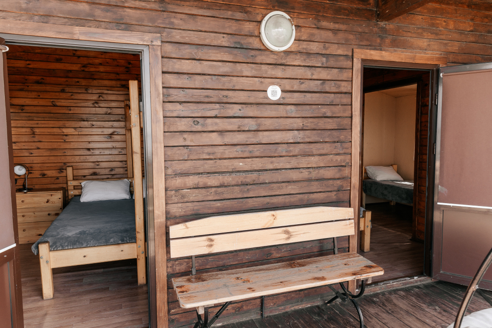В каждой спальне расположены кровати — односпальная, двуспальная и двухъярусная. Также для удобства гостей в комнатах есть полки, зеркало, холодильник, чайник, плитка, посуда и постельные принадлежности.