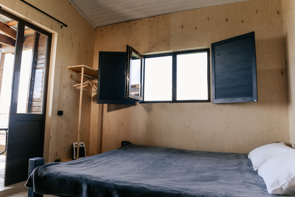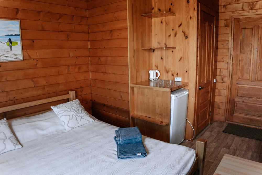 Номер оснащен деревянной мебелью - двуспальная кровать, полки, комод. В каждом номере холодильник, чайник и постельные принадлежности. Из номера есть выход на собственную террасу, оборудованную столиком и стульями. Номер оснащен санузлом: туалет и горячий душ.