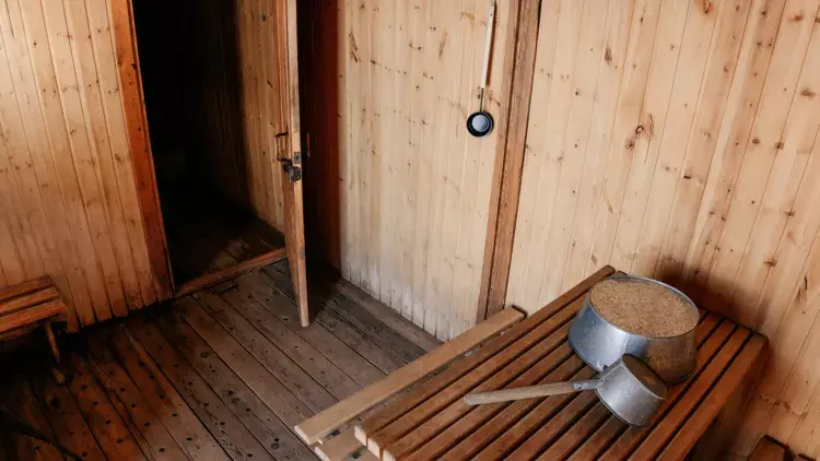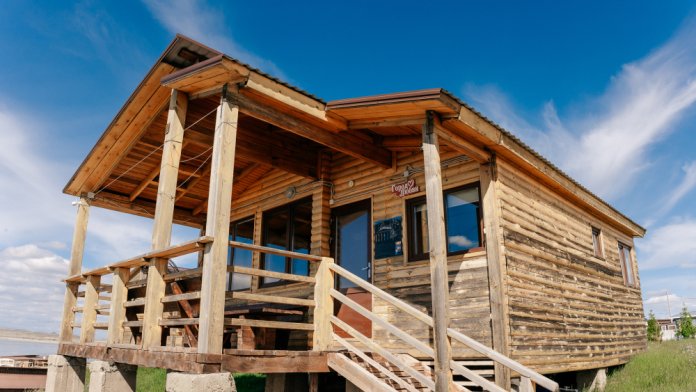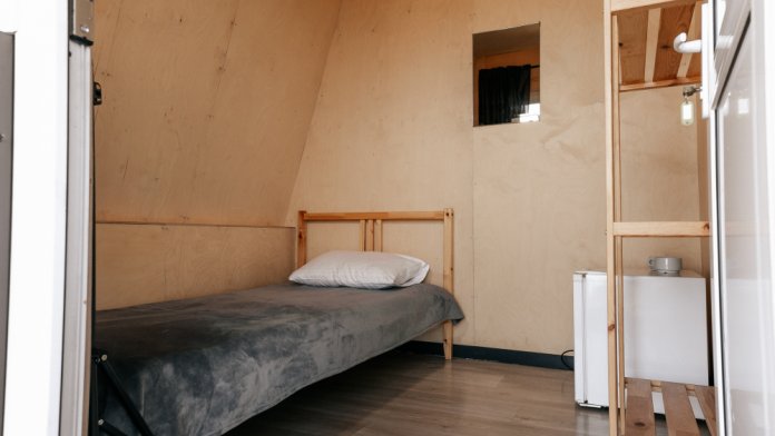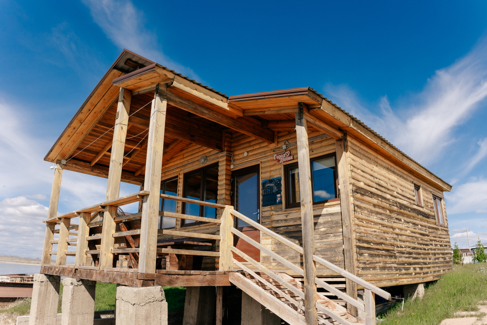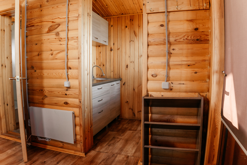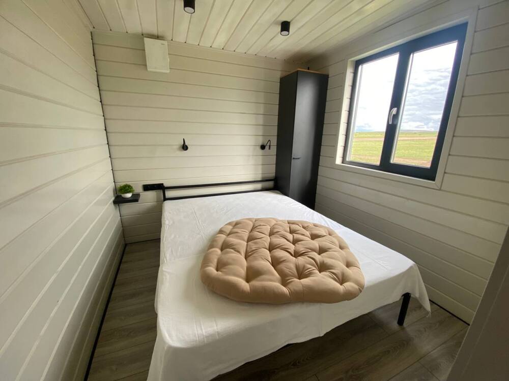 Дом разделен на две спальных комнаты, кухню и санузел (туалет, горячий душ и умывальник). Кухня оборудована холодильником и чайником, плиткой и посудой.