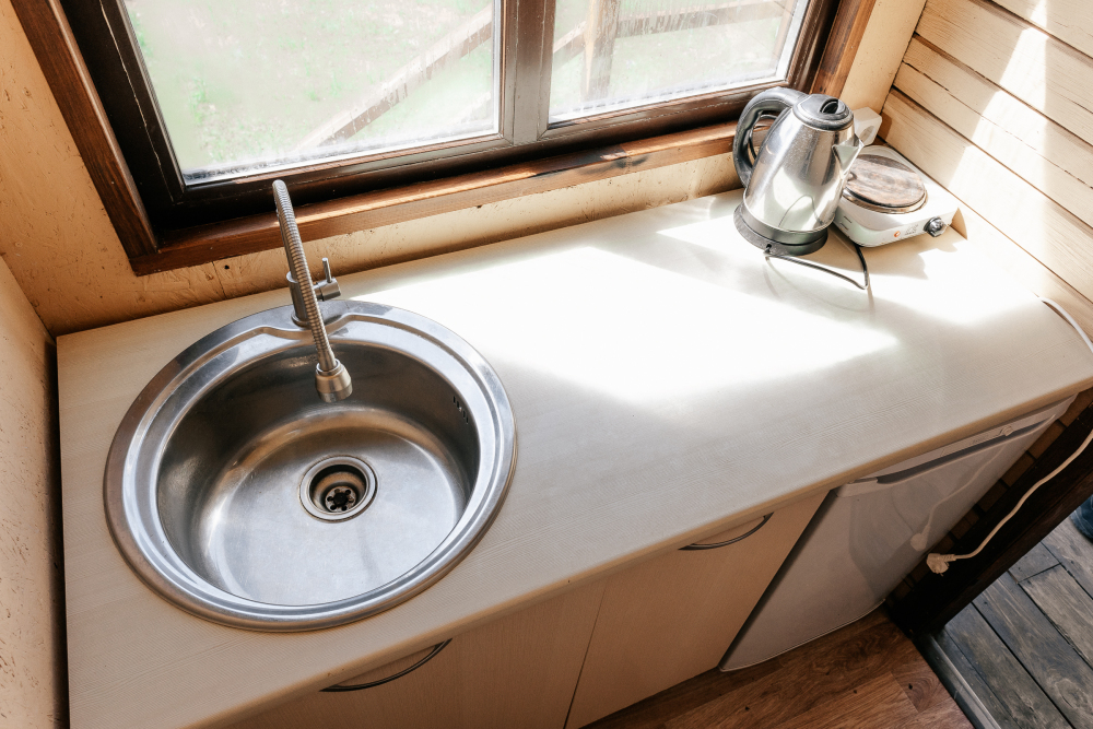 В доме оборудована мини-кухня с холодильником, чайником, плиткой и посудой.