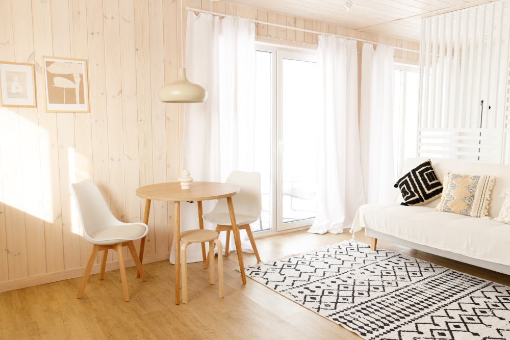 В гостиной оборудована кухня с холодильником, плитой и большой зоной готовки. Здесь есть обеденный стол со стульями и большой диван. Проживание с животными в данной категории запрещено.