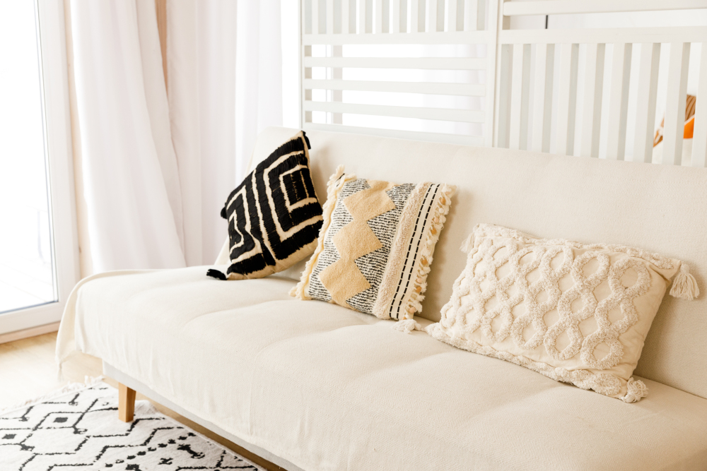 В первой комнате стоит двуспальная кровать и раскладной мини-диван, который можно использовать в качестве дополнительного спального места для ребенка. Во второй комнате стоит раскладной двуспальный диван. Есть тумбочки, полки, комод и зеркало.