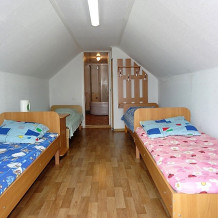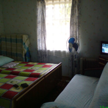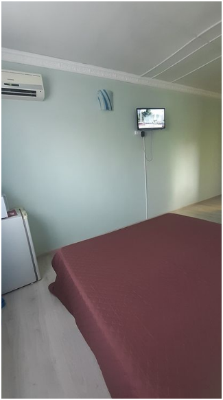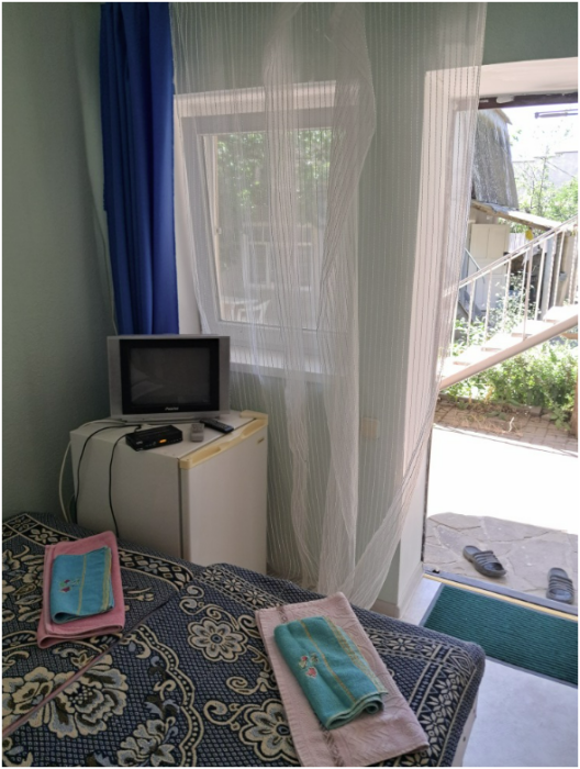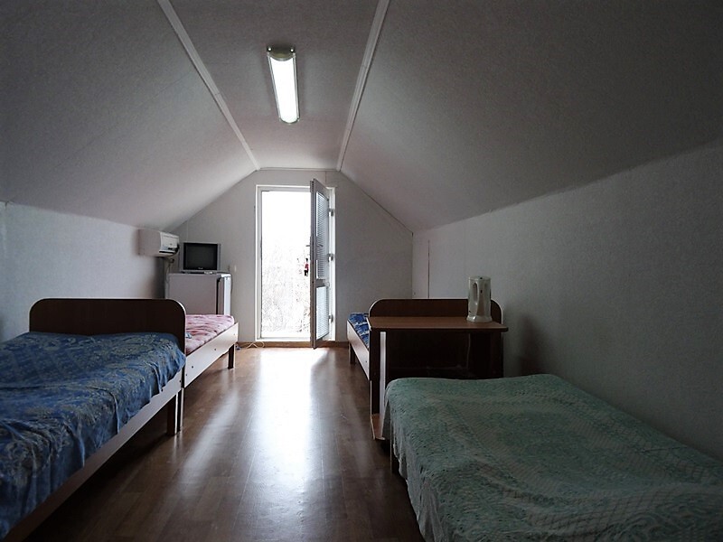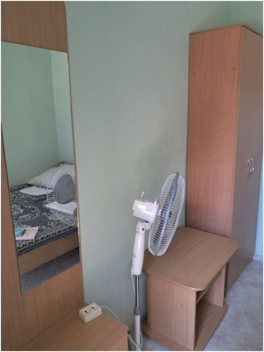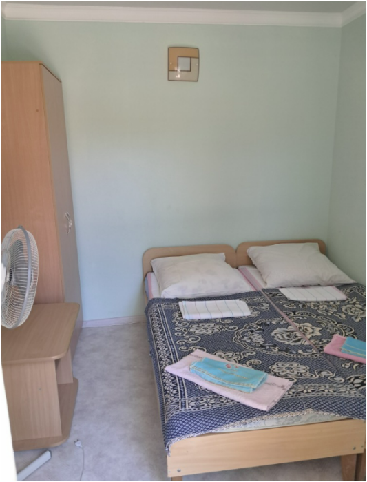 Небольшая уютная комната с двумя кроватями, телевизором, холодильником, вентилятором. Имеется журнальный столик, прикроватные тумбочки, Вешалка для одежды с зеркалом, тумба для обуви. Душ и туалет персональные в отдельных кабинках в 10 метрах от номера.
