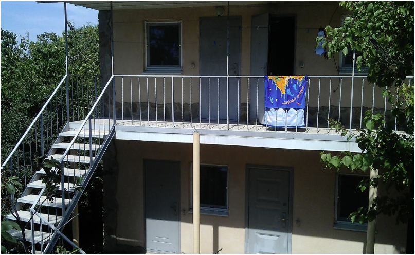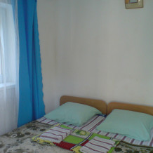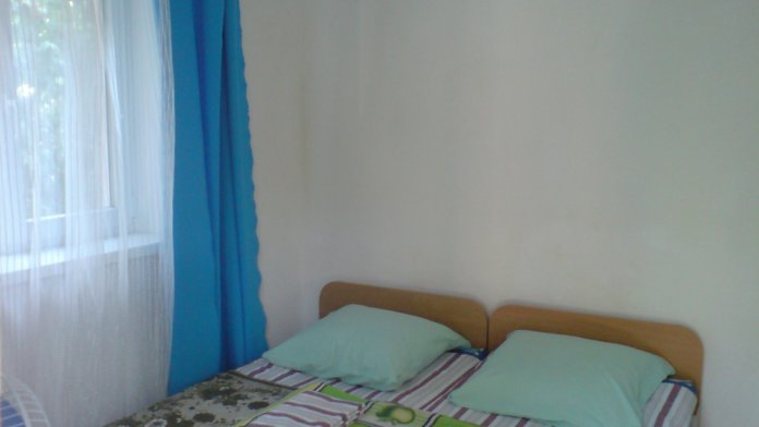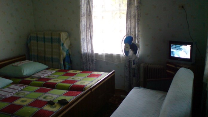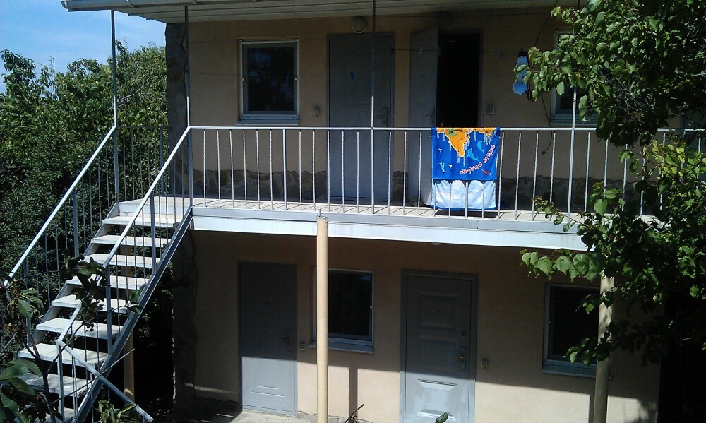 Номер в садовом домике старой постройки. В номере панцирные полуторные кровати с ватными матрасами, есть балкон, основной недостаток - неудобная крутая металлическая лестница, низкий потолок , удобства во дворе общие.