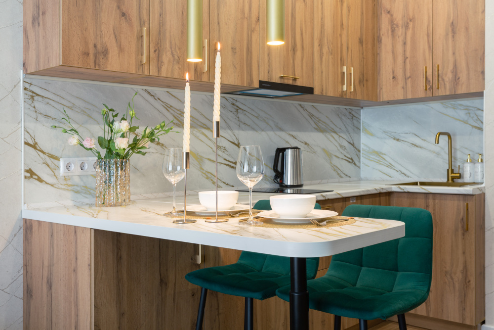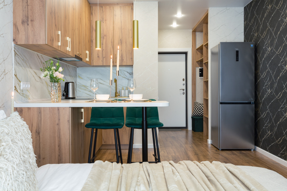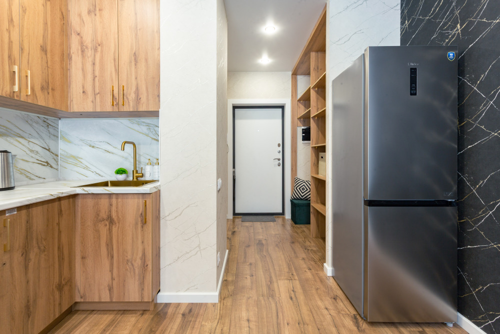 • Зона кухни: холодильник, плита, микроволновка, чайник, вся необходимая посуда