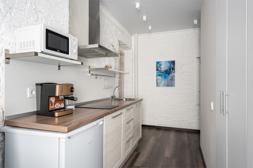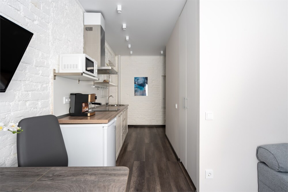 - Полноценная кухонная зона с электрической плиткой, микроволновой печью, холодильником и раковиной.