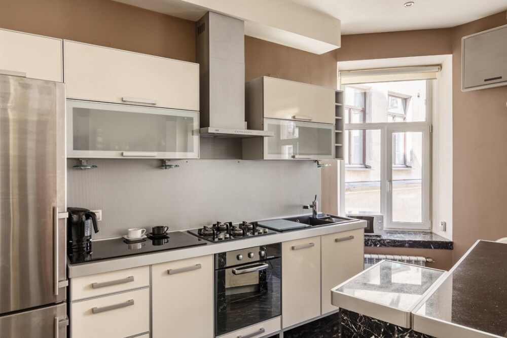 - Полноценная кухня с газовой плитой, духовкой и посудомойкой.
