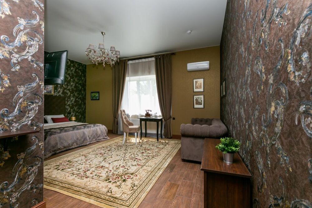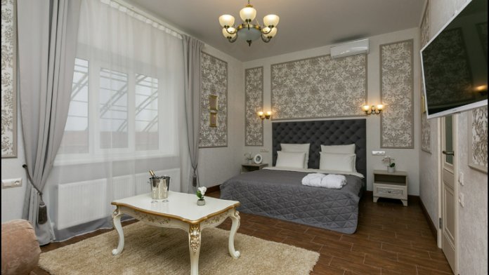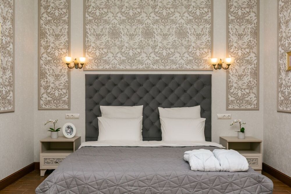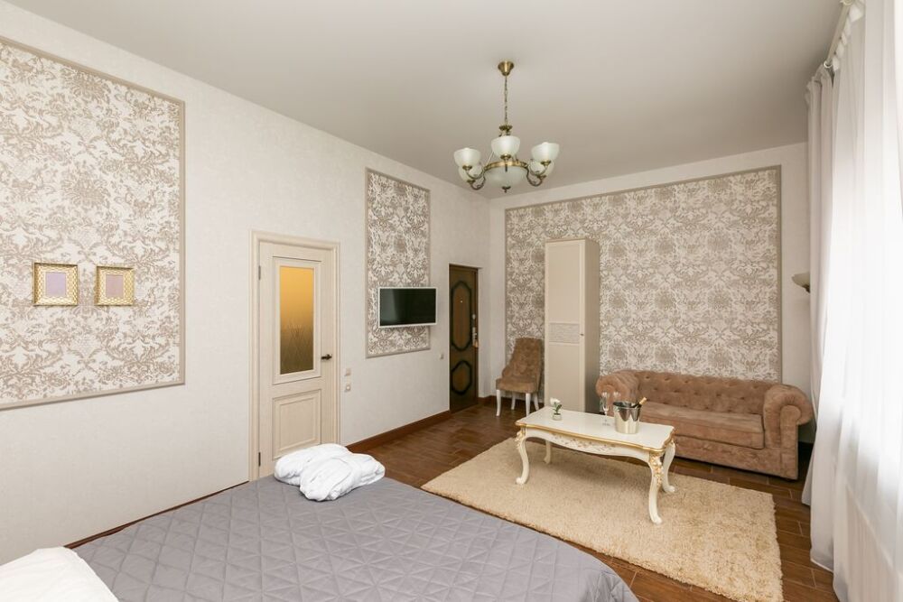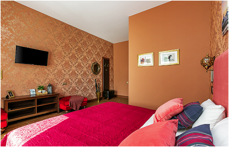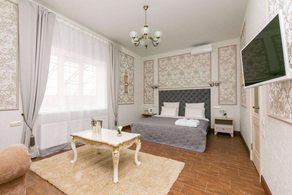 Номер выдержан в мягких тонах, изящная мебель с огромной кроватью, матрас с эффектом памяти класса Hi и главное: своя особая атмосфера, атмосфера загадочности и страсти. Вы захотите вернуться и испытать всё снова.