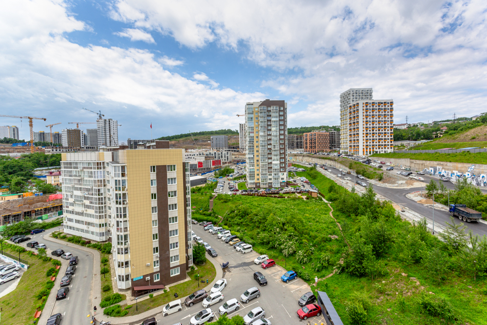 Развязка на выезд из города, в город и на о. Русский. Рядом имеются магазины, Супермаркет, Кафе и т.д. Автобусная остановка в 5мин. Прекрасный современный двор, где расположены: спортивная площадка, детская площадка, баскетбольное поле, места отдыха.