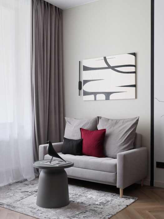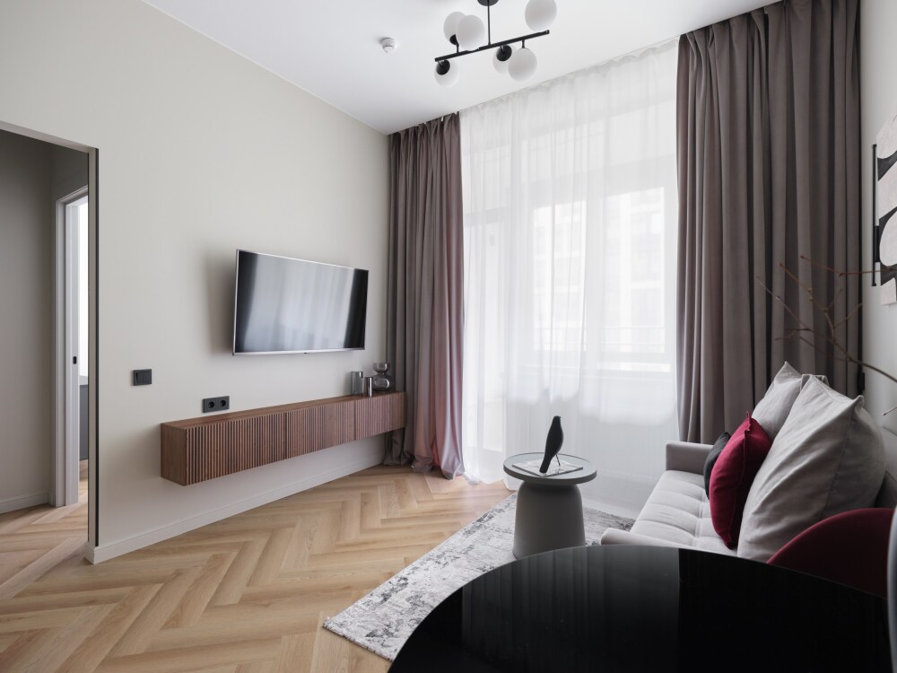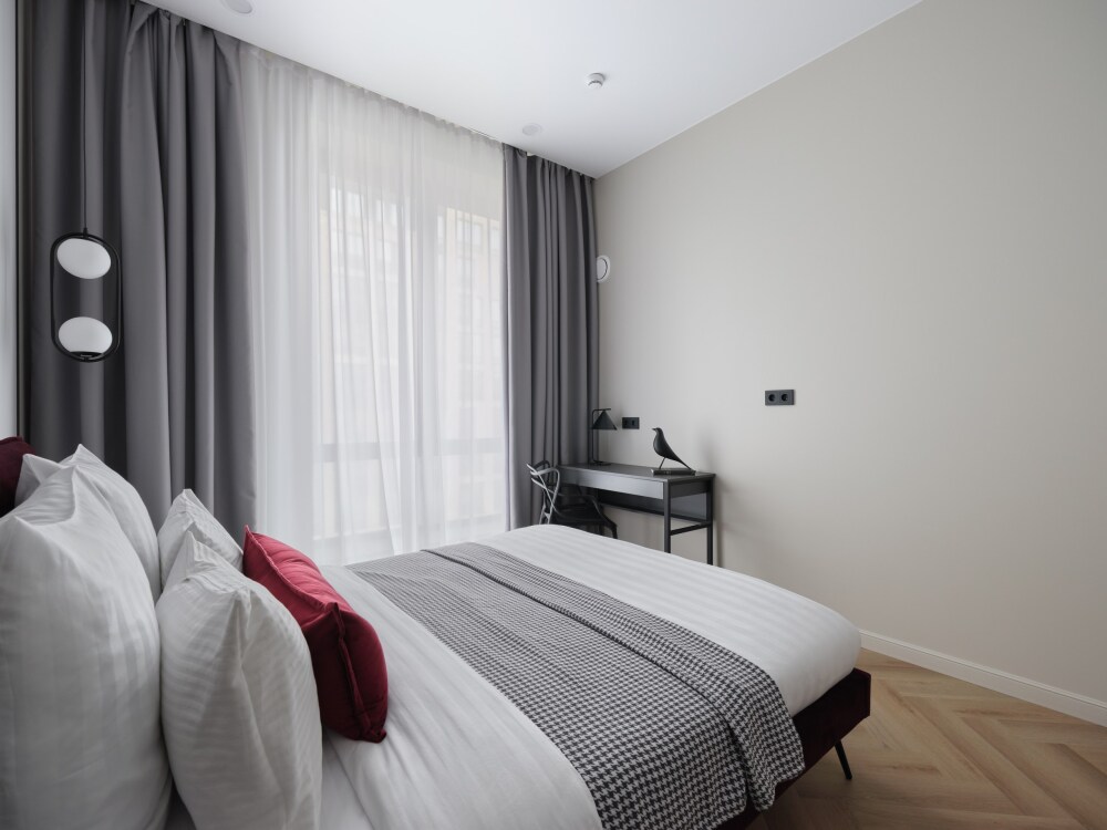 В апартах приятно находиться, много воздуха и света, есть застекленная лоджия, шторы блэкаут, кондиционер.