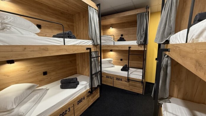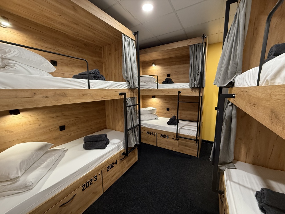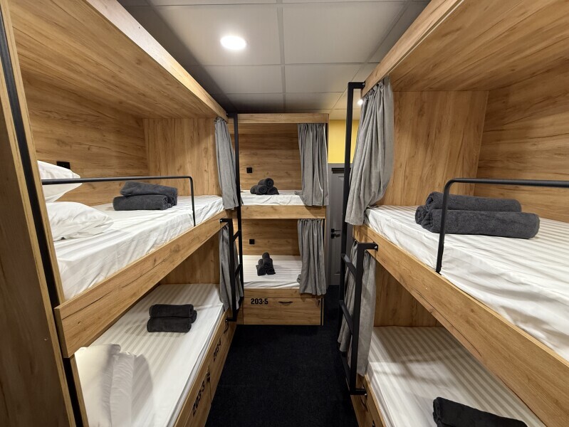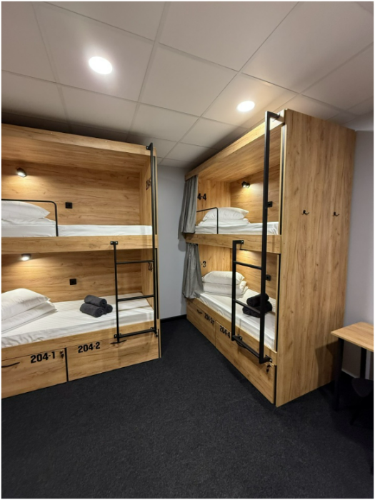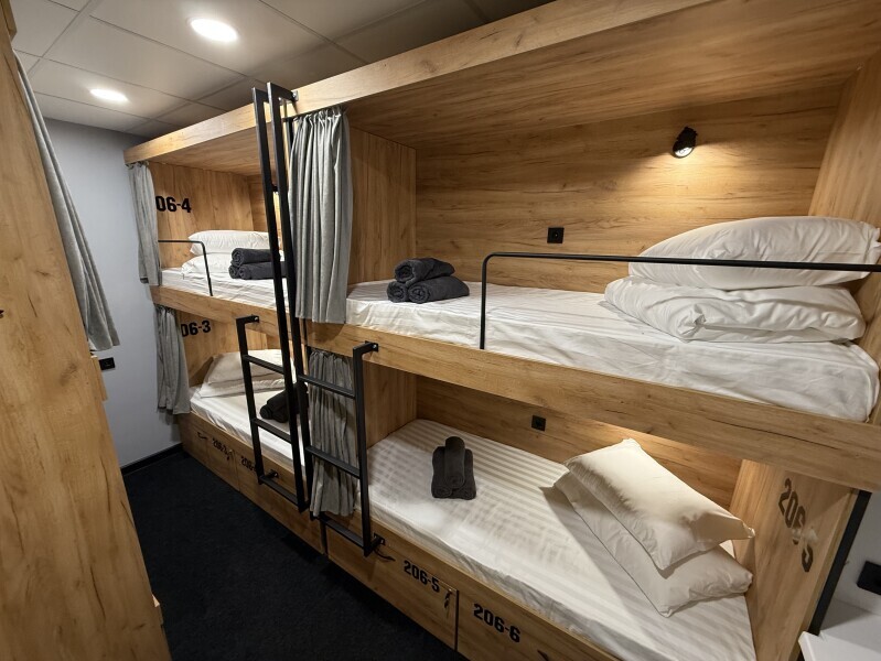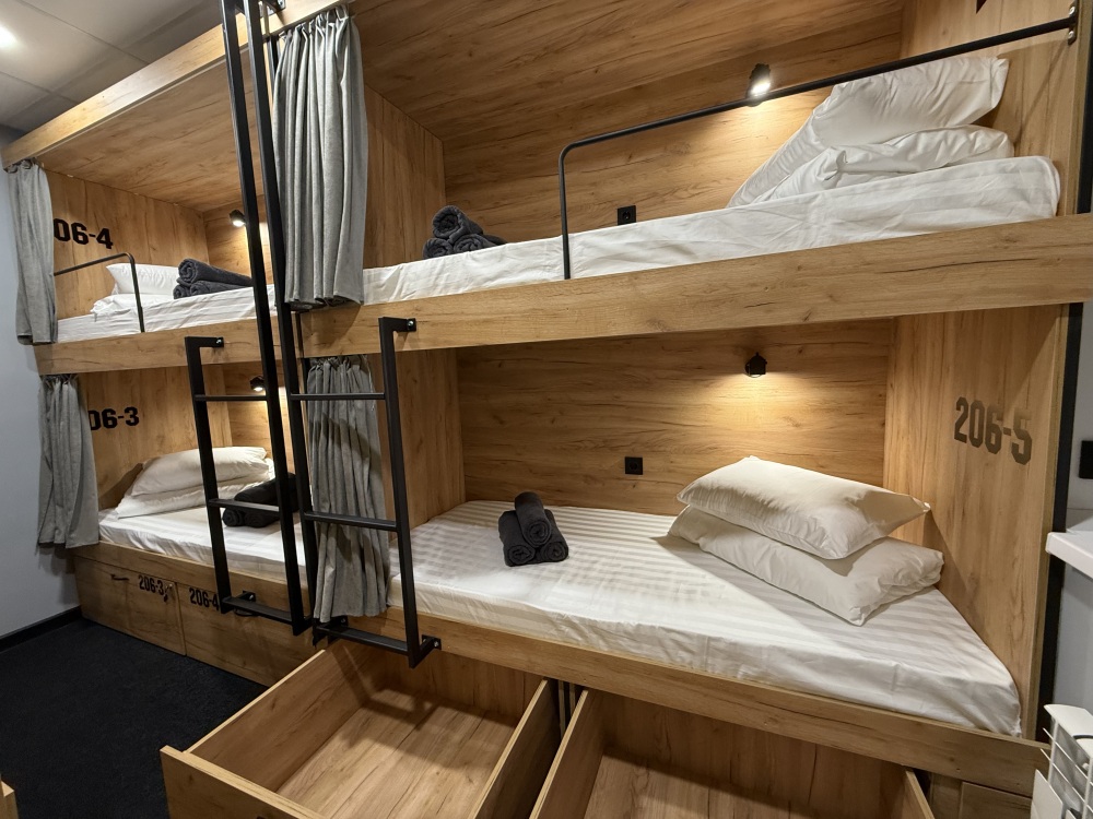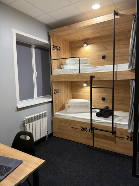 Комфортный номер с 4-мя двухъярусными кроватями. Каждая кровать с индивидуальной розеткой и освещением, закрывающаяся шторка позволяет создать уединенное пространство.