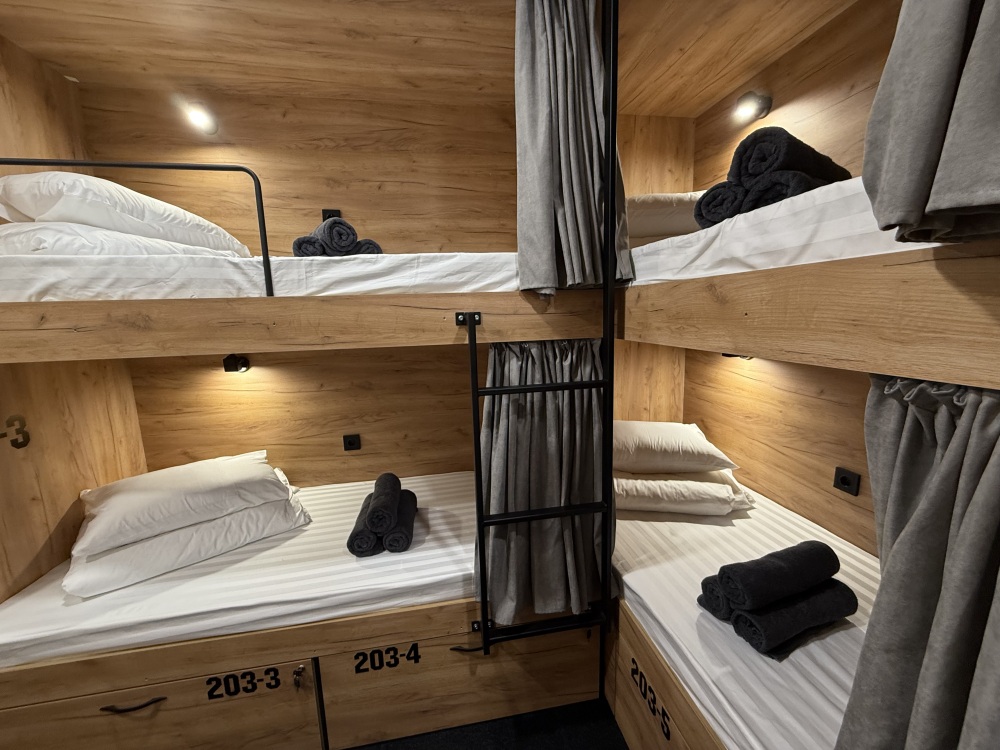 Комфортный номер с 2-мя двухъярусными кроватями. Каждая кровать с индивидуальной розеткой и освещением, закрывающаяся шторка позволяет создать уединенное пространство. Всегда чистое и свежее постельное белье, полотенце.
