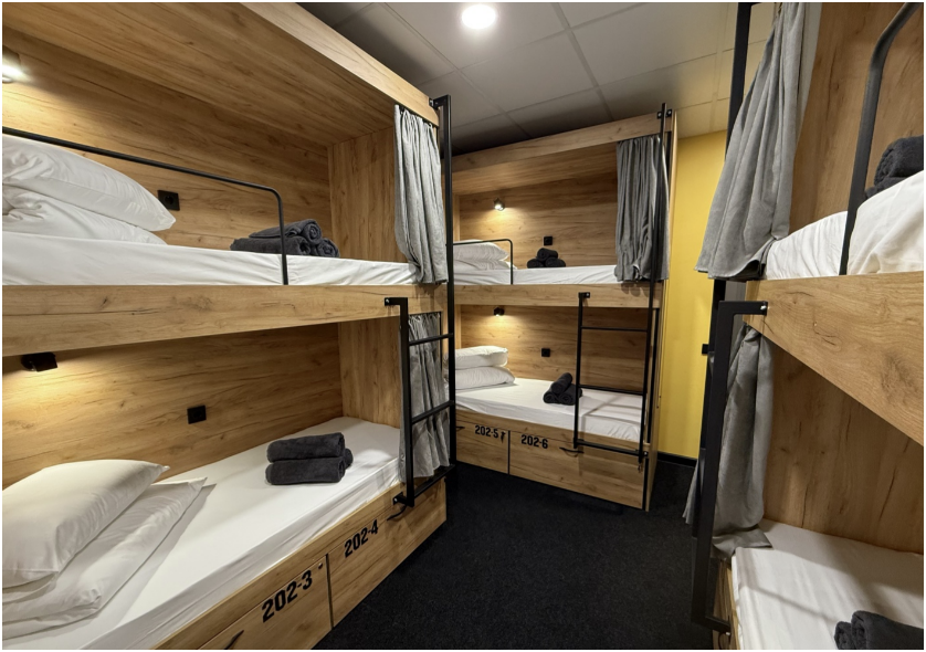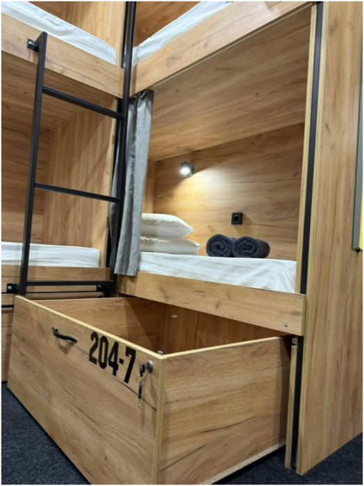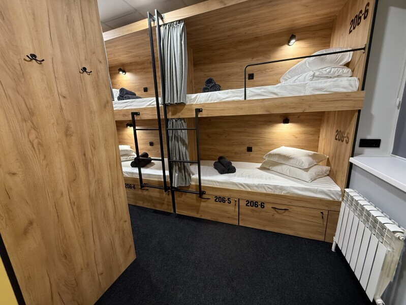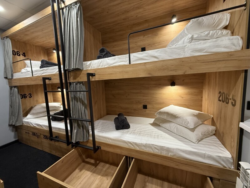 Комнаты оснащена несколькими двухъярусными кроватями, каждая из которых имеет индивидуальное освещение и розетку. Кровати обшиты мягким текстилем и шторками для обеспечения приватности. У нас Вы сможете не только отдохнуть, но и познакомиться с новыми людьми, узнать больше о нашей культуре и открыть для себя удивительную Казань.