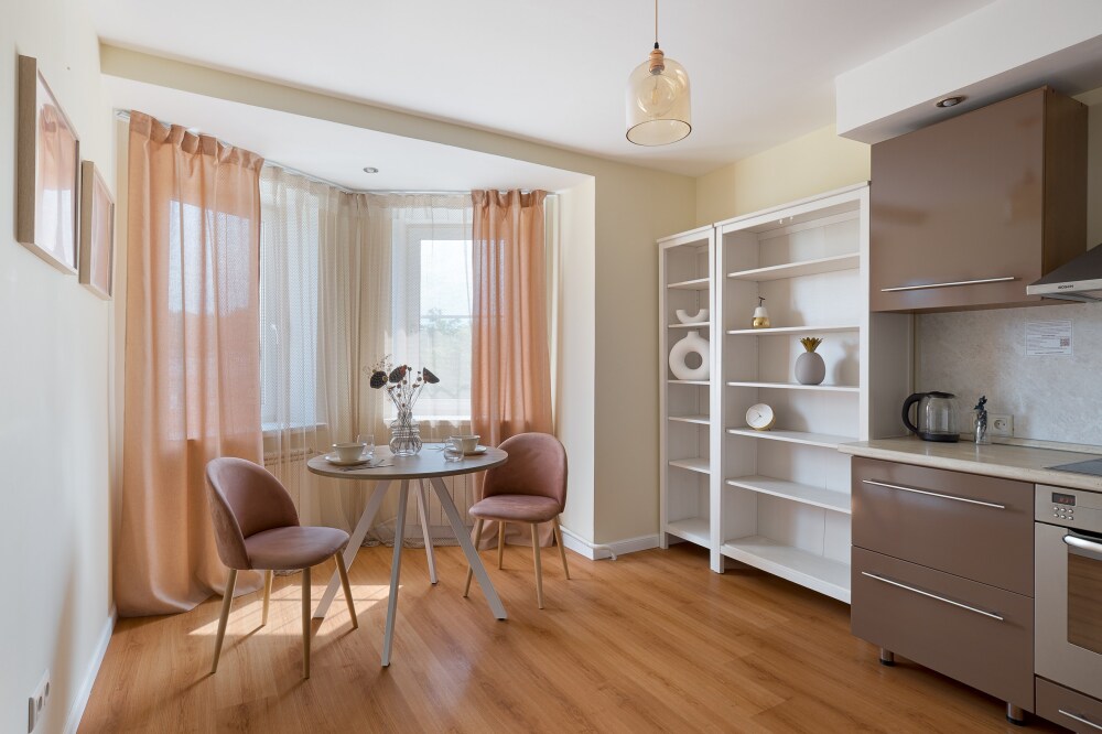 Современная мебель и ремонт, имеется вся необходимая бытовая техника, вплоть до блендера и мультиварки, посуда.