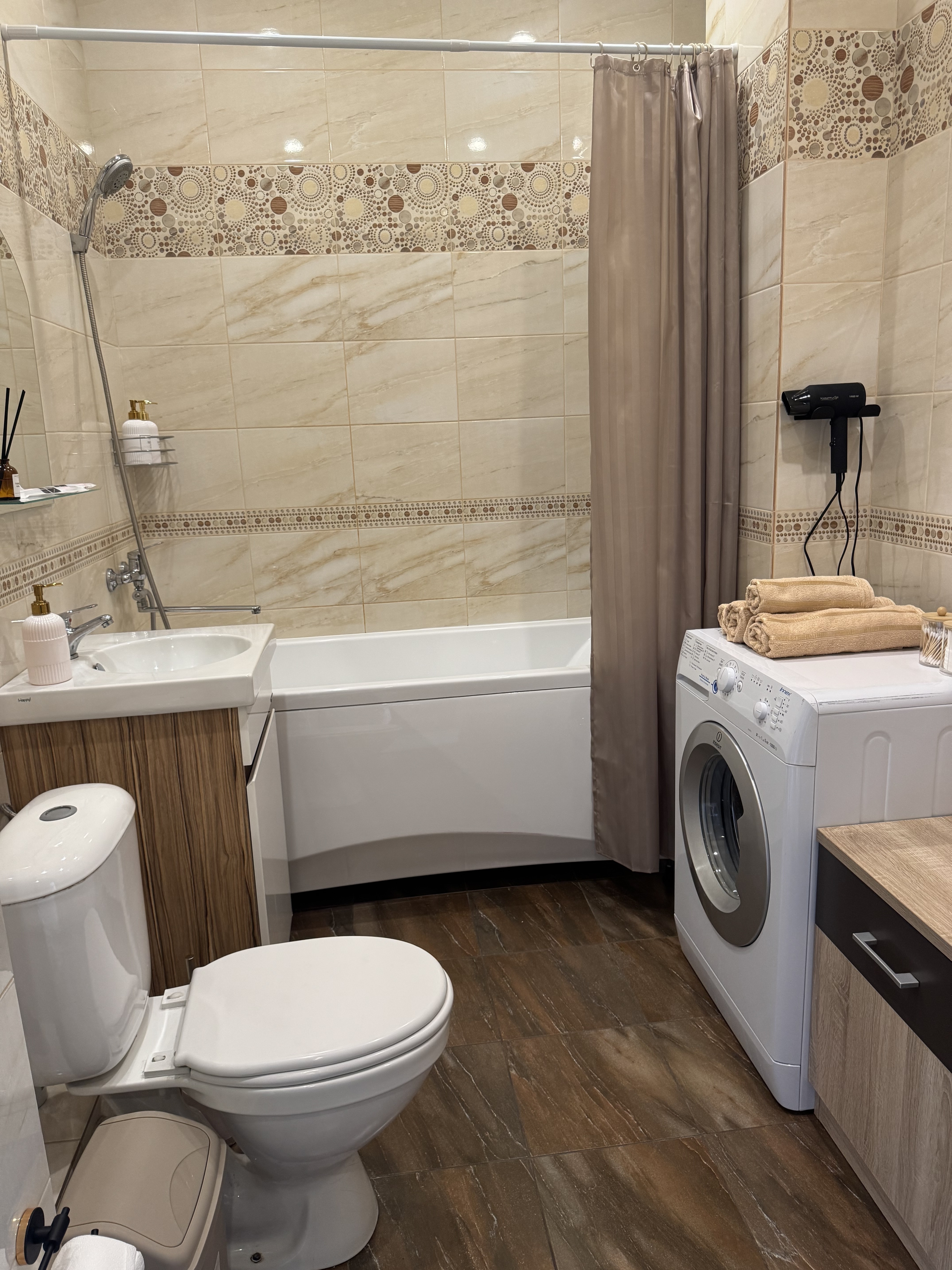 - полностью оборудованная кухня: плита, духовой шкаф (печёт что угодно), микроволновка, холодильник, чайник;