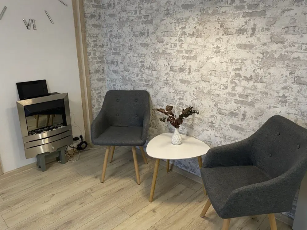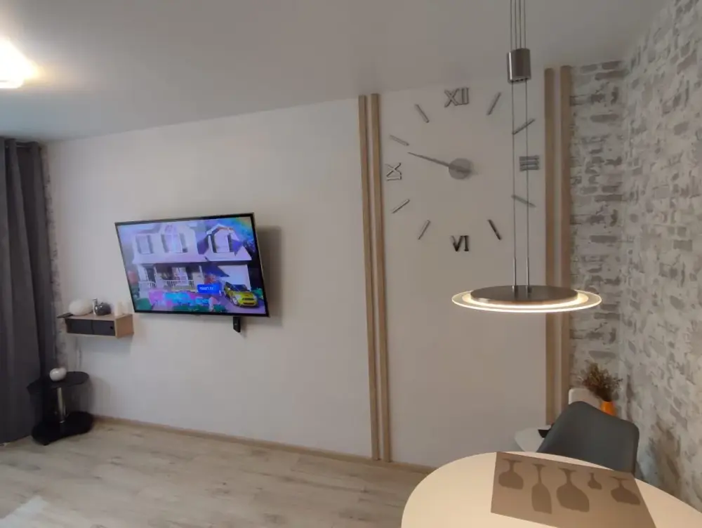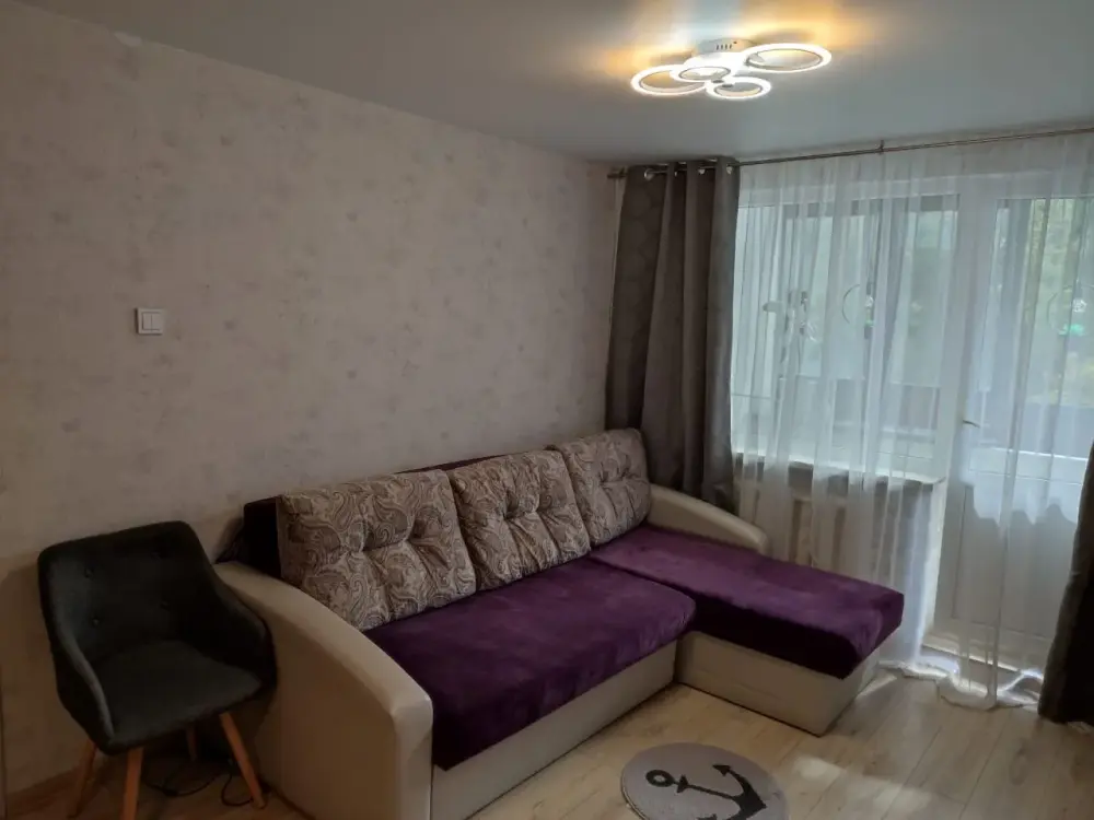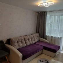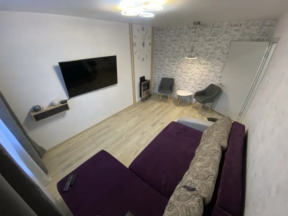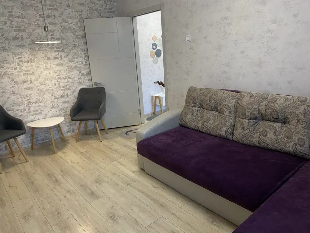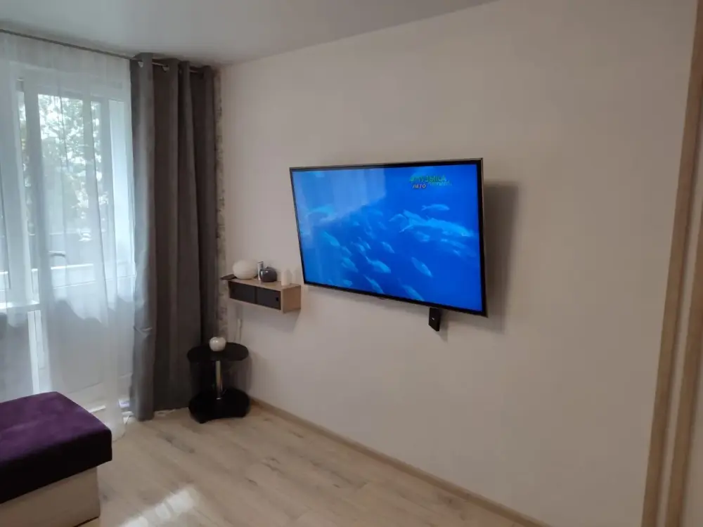 Потенциальным проживающим предложена квартира с необходимой бытовой техникой и мебелью. В ней - диван, большой современный телевизор, санузел.
