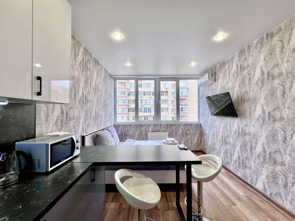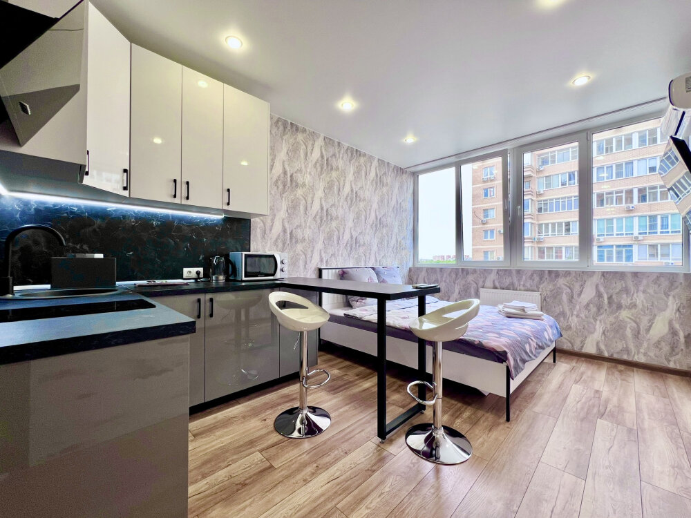 Дорогие клиенты, доброго времени суток. Представляем Вашему вниманию чистую и уютную студию с дизайнерским ремонтом в Фестивальном микрорайоне в жилом комплексе «Цветы». Парковка под шлагбаумом, где удобно и безопасно оставить машину. Если Вы путешествуете с детьми, то они смогут весело провести время на оборудованной детской площадке (площадка очень большая в закрытом дворе с прорезиненной поверхностью для минимизации травм, есть футбольное поле, теннисные столы, горки, песочницы, качели, тренажеры, турники). Во дворе жилого комплекса есть кофейни, аптеки, магазины, маркетплейсы, салоны красоты и многое другое. В шаговой доступности остановки общественного транспорта, продуктовые магазины, кафе, банки, «Табрис». До центральной улицы Красная - всего 2,9 км.