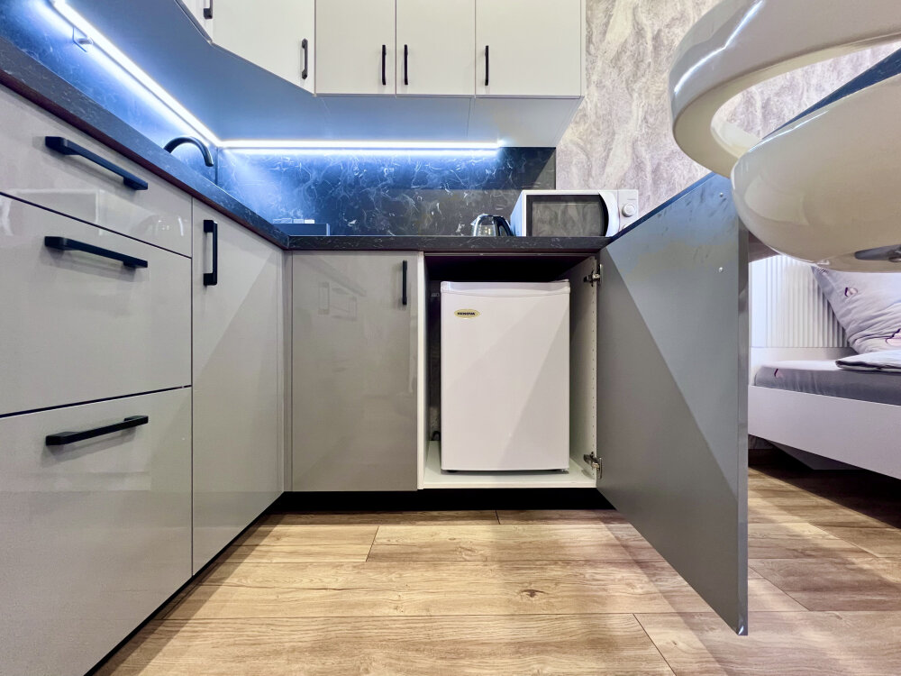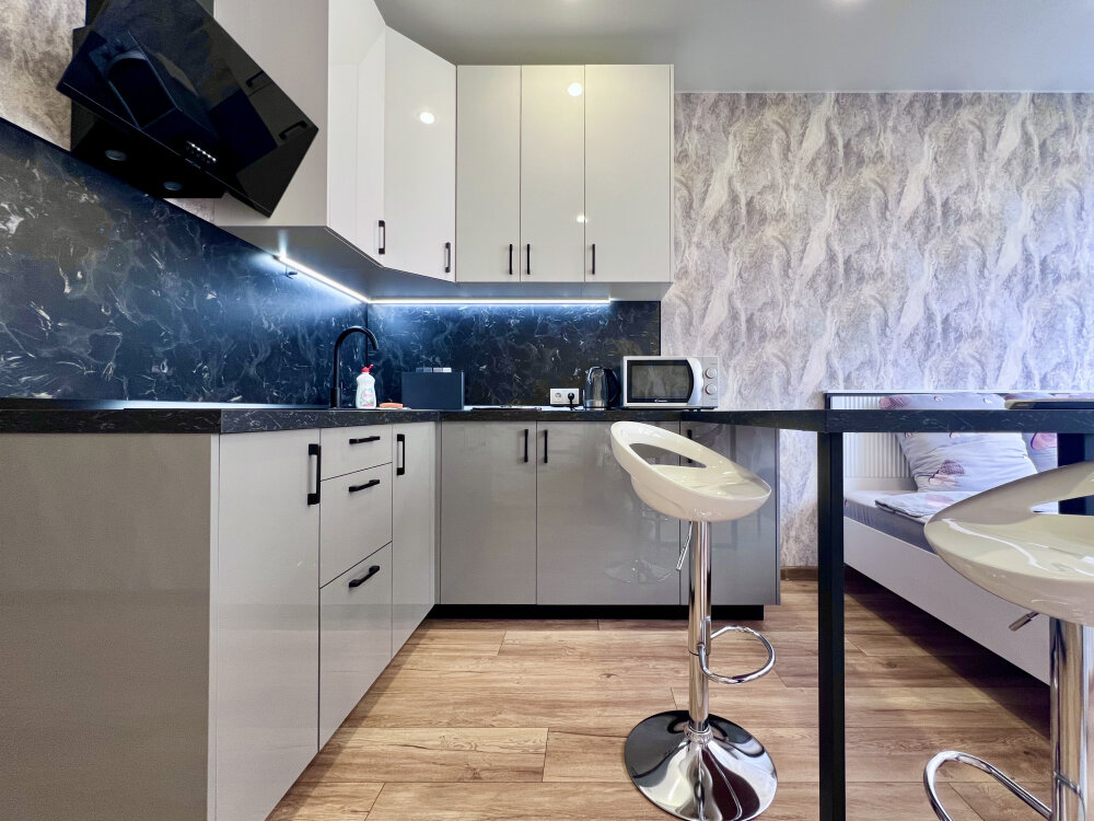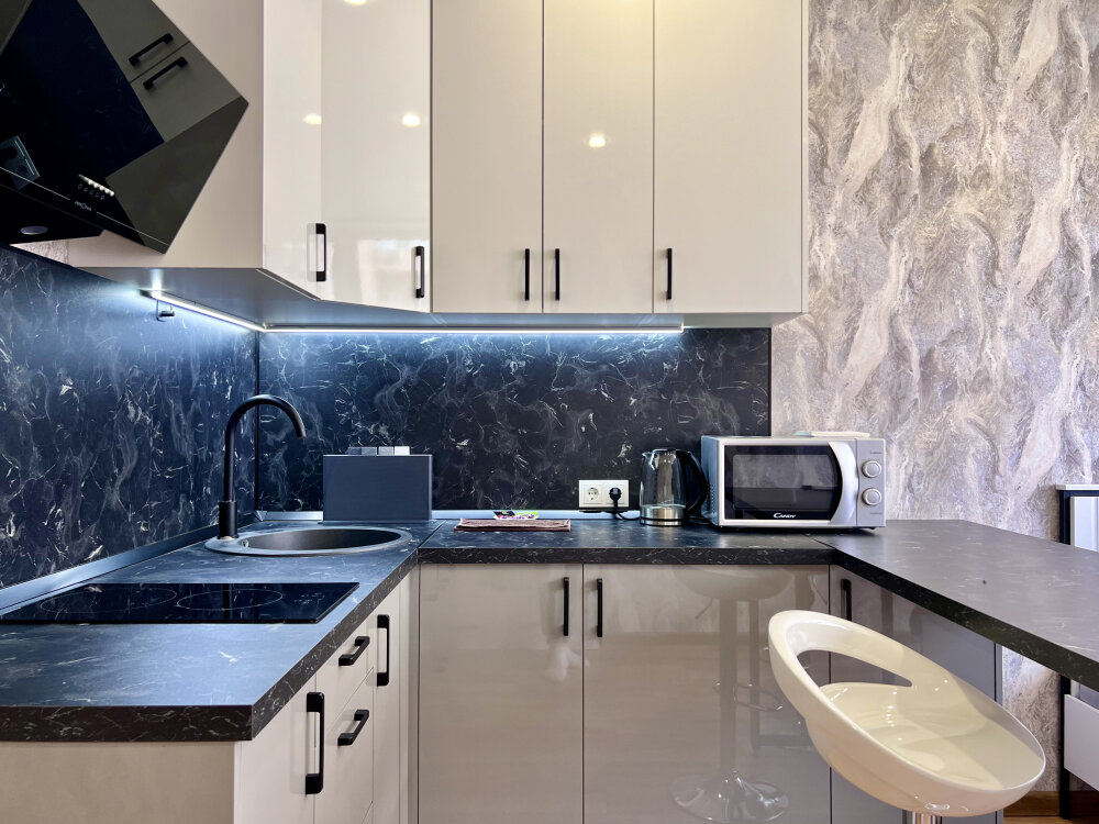 - наши гости могут готовить на полностью оборудованной кухне с бытовой техникой и посудой. Есть плита , вытяжка, электрический чайник, микроволновая печь и холодильник;