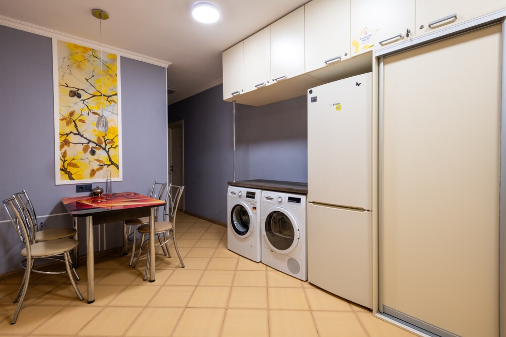Имеется телевизор, кондиционер, шкаф, вешалка, рабочий стол, чайник, холодильник, стулья, зеркало, посуда, плита, столовые приборы, стиральная машина, сушилка для белья, утюг, гладильная доска.