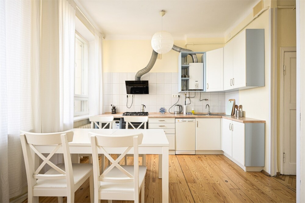 - Газовая плита, духовка, микроволновая печь, чайник и холодильник, посудомоечная машина.