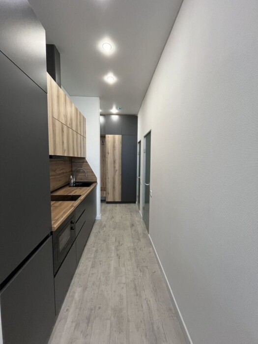 Техника на кухне: встроенный холодильник, индукционная плита, электрочайник, микроволновка.